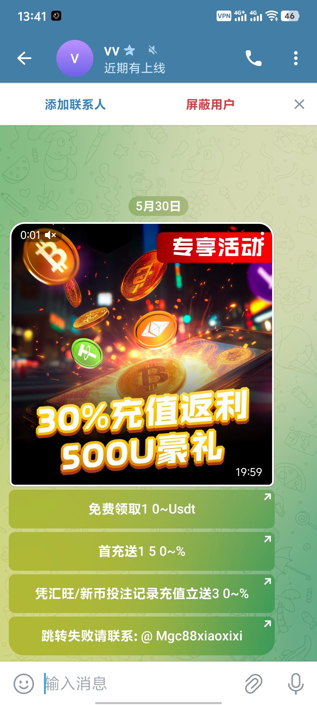 电报收到了一个人的消息,说注册送10u,然后我就点开那个机器人注册,实际上只领到了5u,百家乐一把飞了,不知道多少提现,有兴趣的可以去试试。