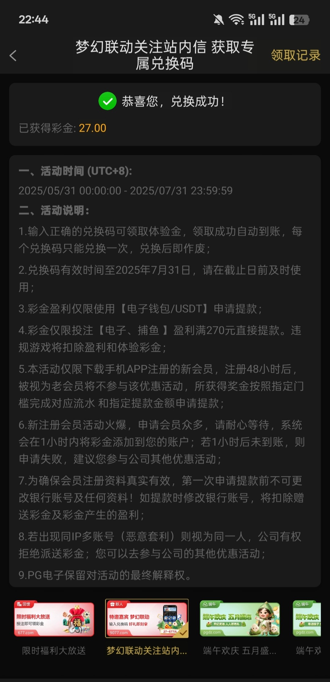 金沙2016太杀了已经好几个月没充值了 刚才登录上去看到有个站内信 有个合作平台会给个注册彩金码 我领了27 打出来350 提u已经到账了 地址 2016.com