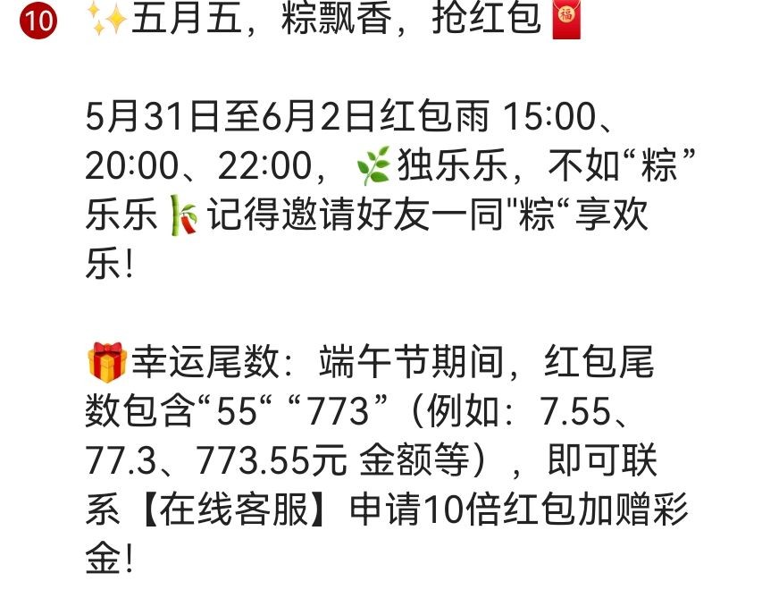 凡是5.31-6.2抢到红包尾数 55 61的可以找客服申请10倍加赠红包这两天抢了红包中奖的别忘了找客服申请另外别的台同样活动的可以放评论区留言