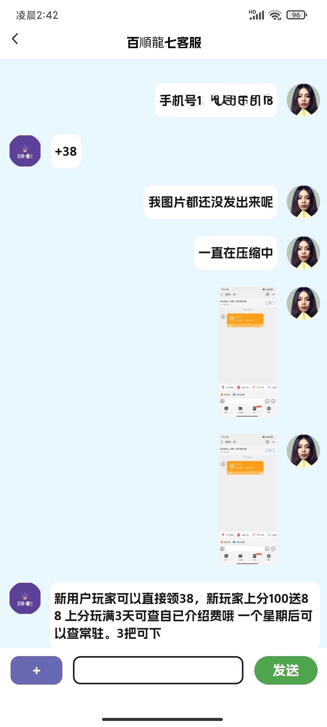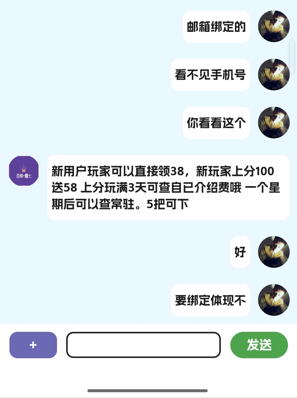 百顺龙七可以发手机号去碰瓷试试,我直接给客服发的手机号直接就给了38,我是注册过的老号没充值玩过,下载链接bslq01.vip,下载码8294
