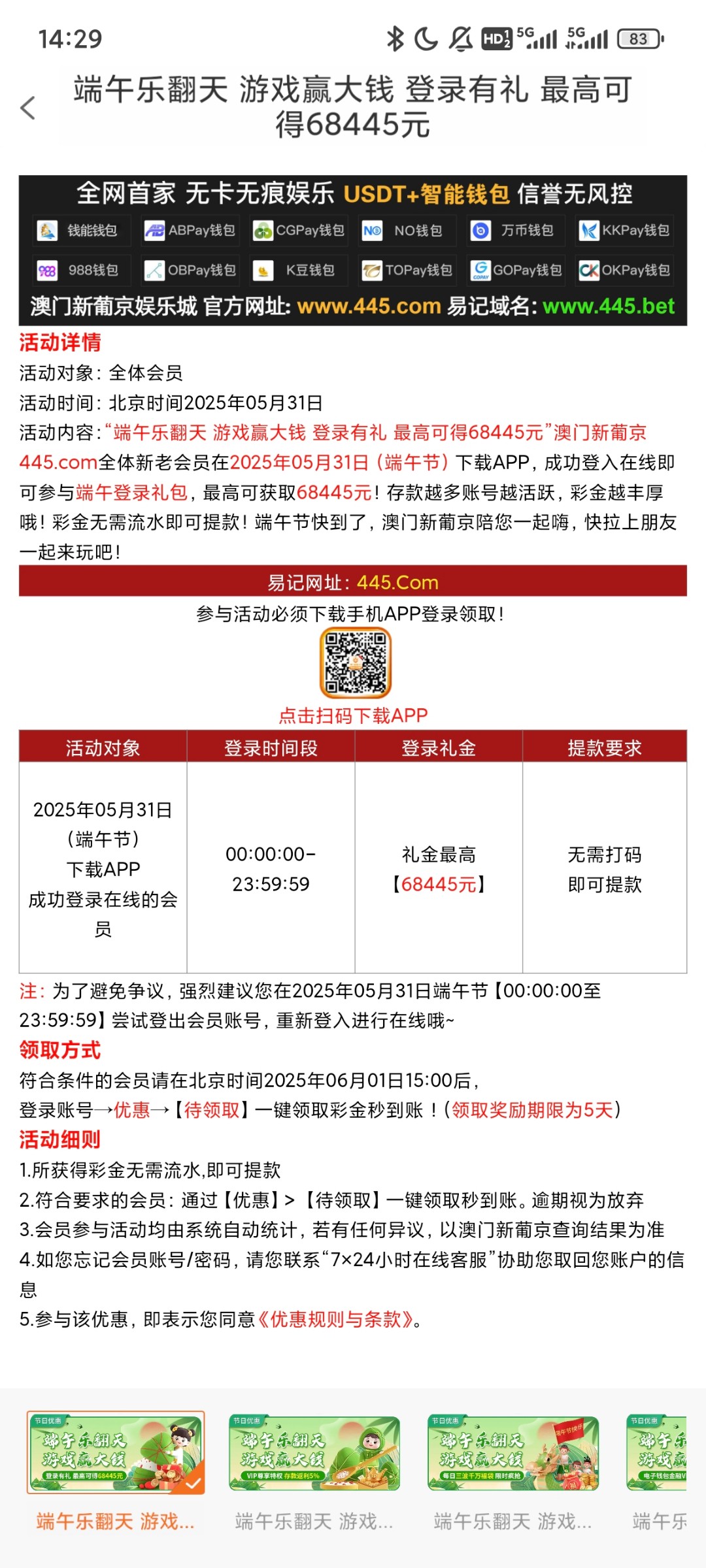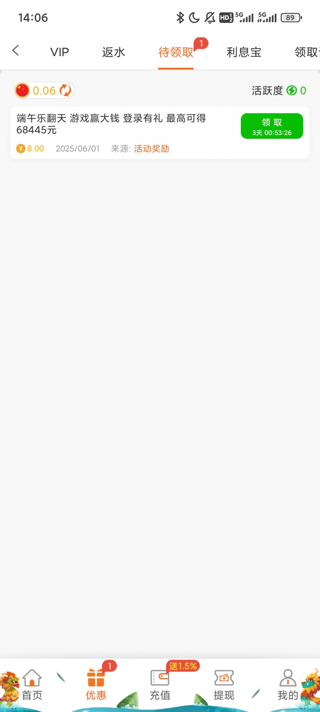 端午节登录过的,可以上去领了,网址 445.com
