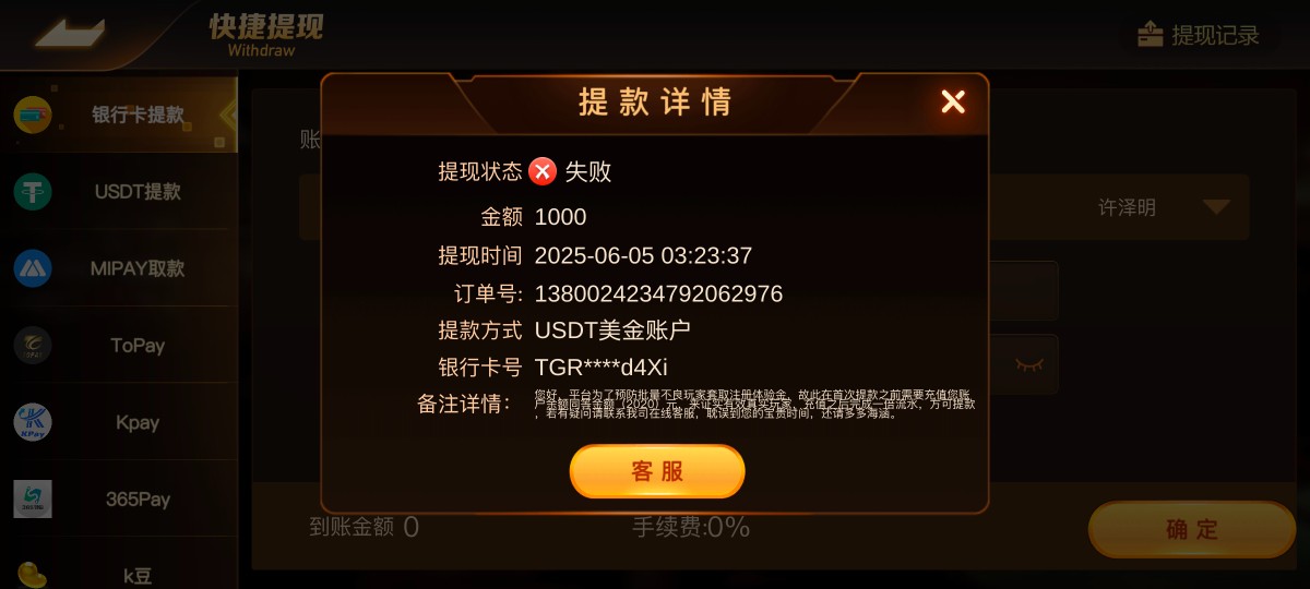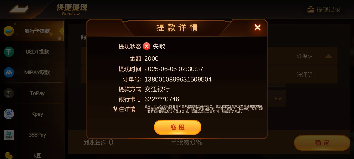 JJ棋牌,之前充值过没赢,过一段时间电话特邀彩金打赢不给提现,原因要充值赢多少充多少,有点黑,大家小心充值啊,退款大额订单异常