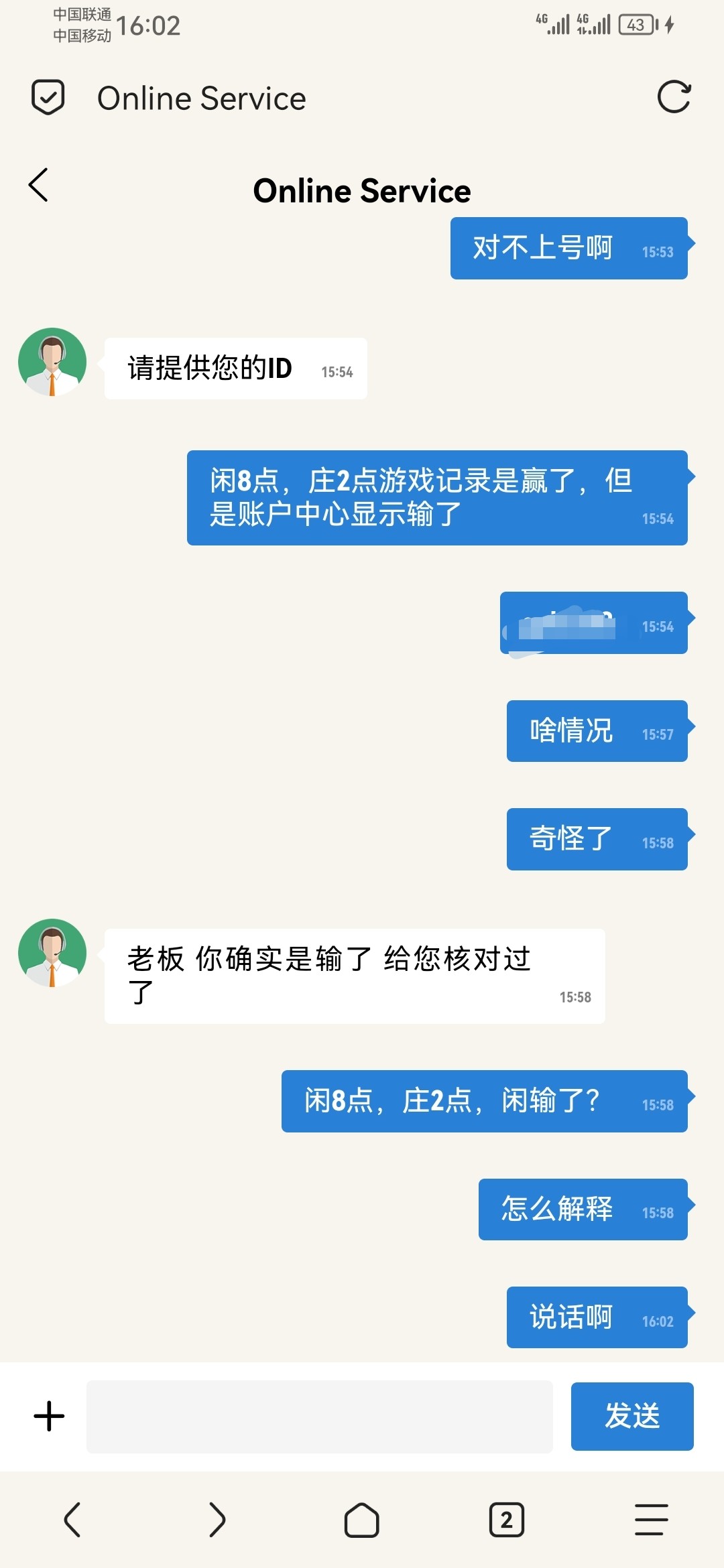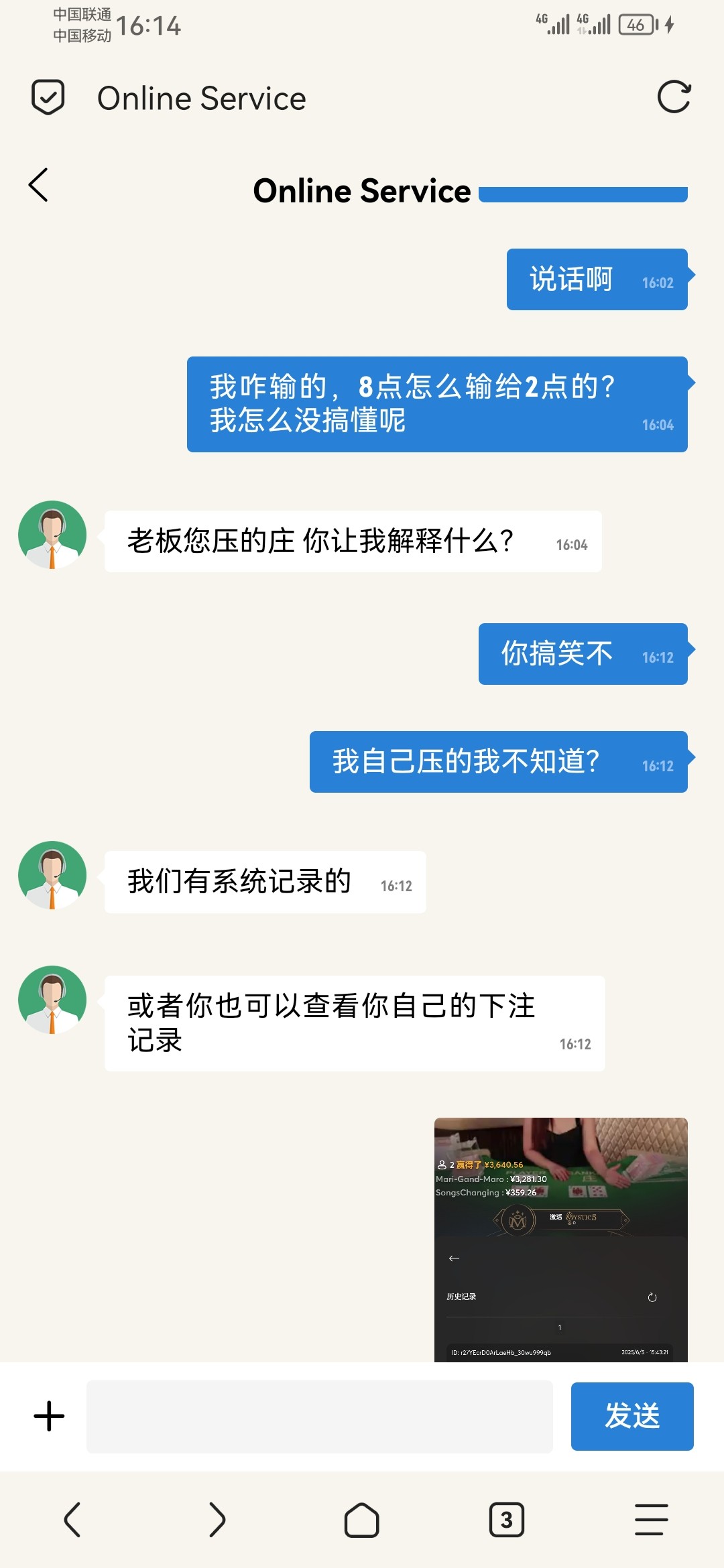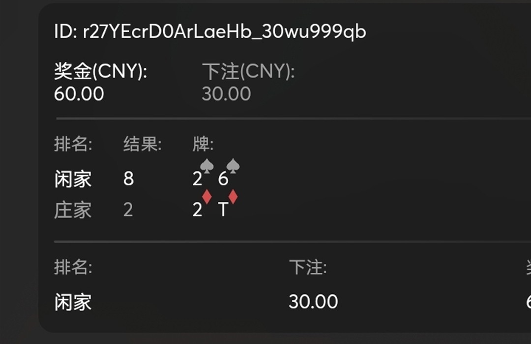闲8点,庄2点,下注的闲,游戏记录显示赢了,账户没钱,退出游戏会员中心显示我输了?啥情况,客服也说我输了,问闲8点怎么输了庄2点,客服没法解释