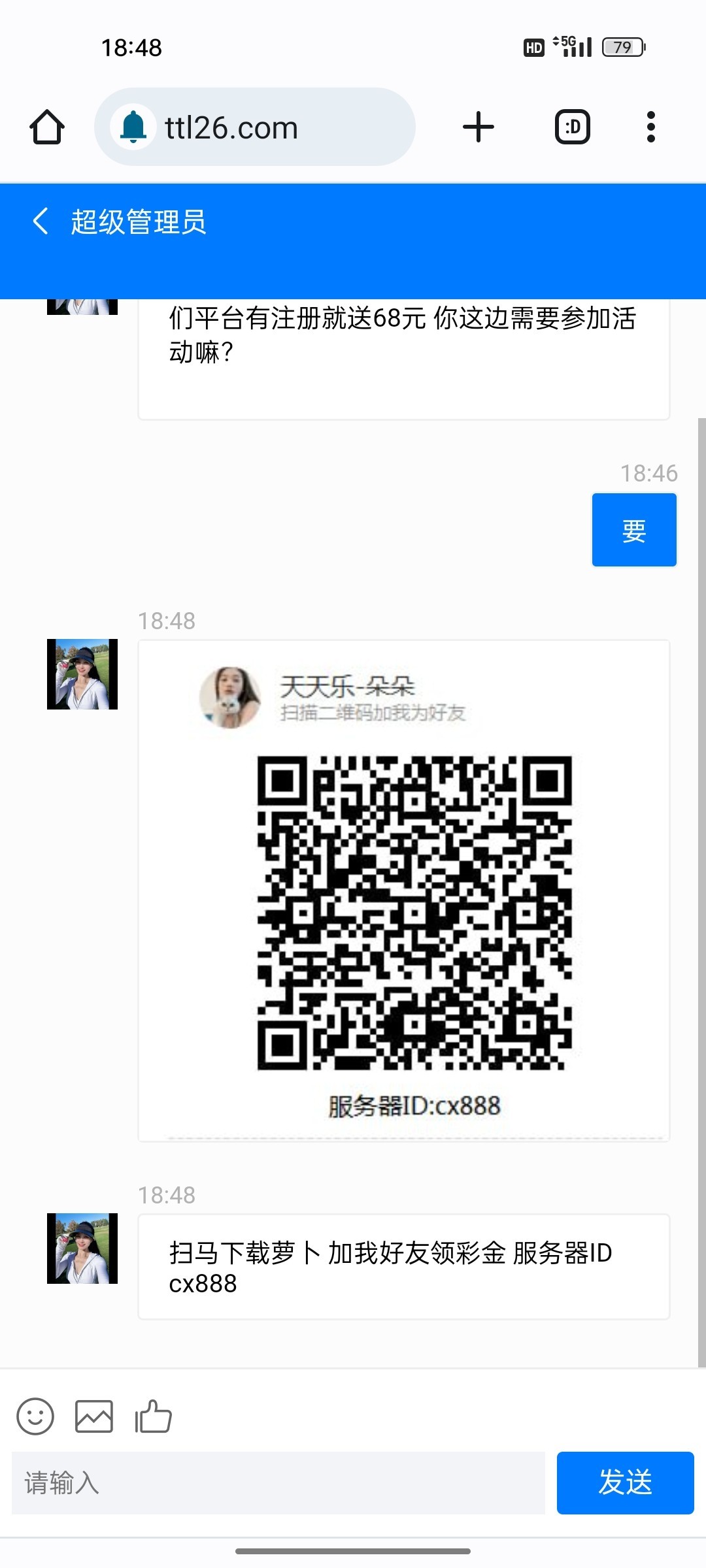 扫码下载萝卜密聊加她发手机号,碰到了第一天送38第二天15第三天15 100提我已到账,不建议充值