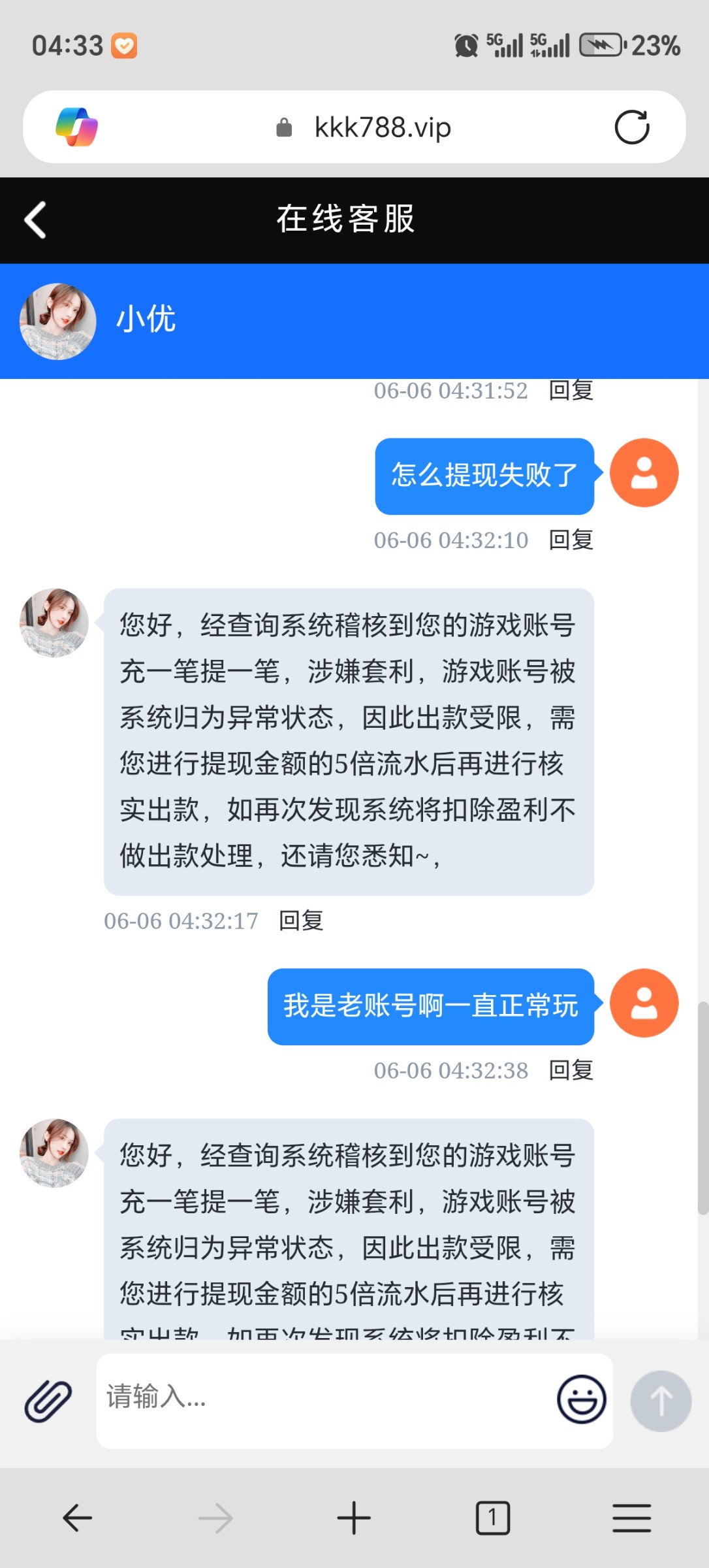 我靠我v10输40w瑟瑟发抖,以前几万几万提都没事的,这个月已经两次了提款罚我5倍水,第一次说真人单边投注,第二次是流水太少,1k上到4.5k,打了7k水还少?自从改了512这个名字