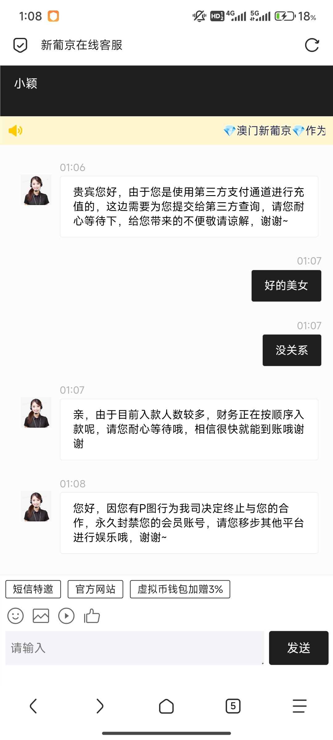 九尾 ▶ xzhxzhxzh159 客服刚刚说的: 请去别的地方处谋生,不要一直制作虚假图片来骗取我们这点微薄的钱了,我们又不是傻子,别以为没收到钱就给你上分。这里不欢迎你. 7月前