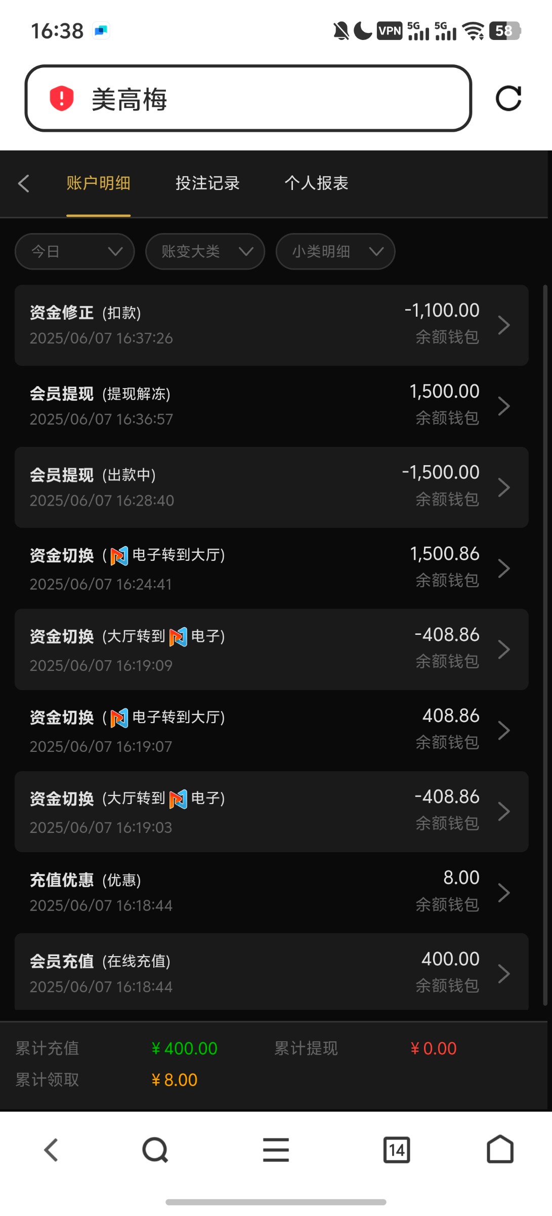 冲了400连中兔子长龙,给我黑款了,400出1500连中就给我黑了,今天太倒霉了,被黑了一张卡密,然后充值也被黑