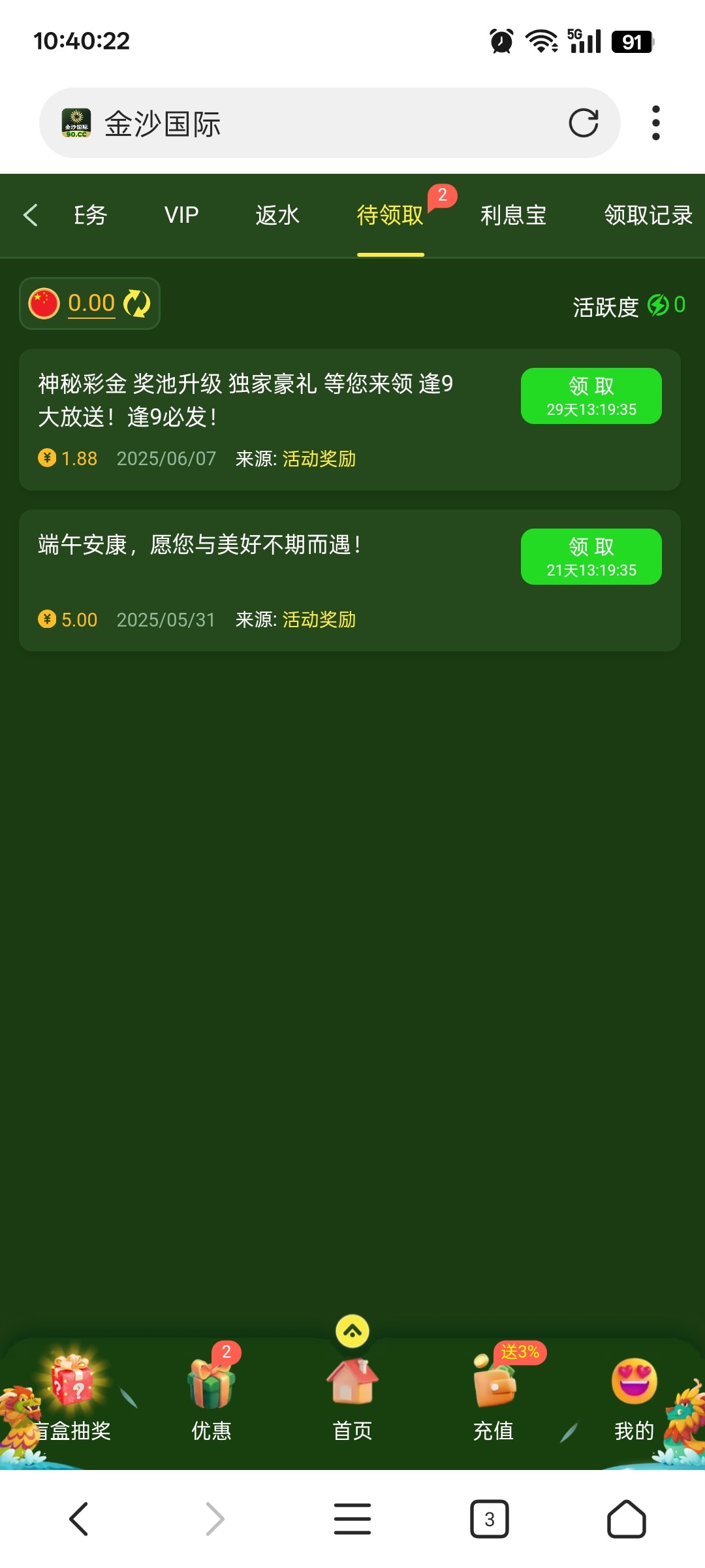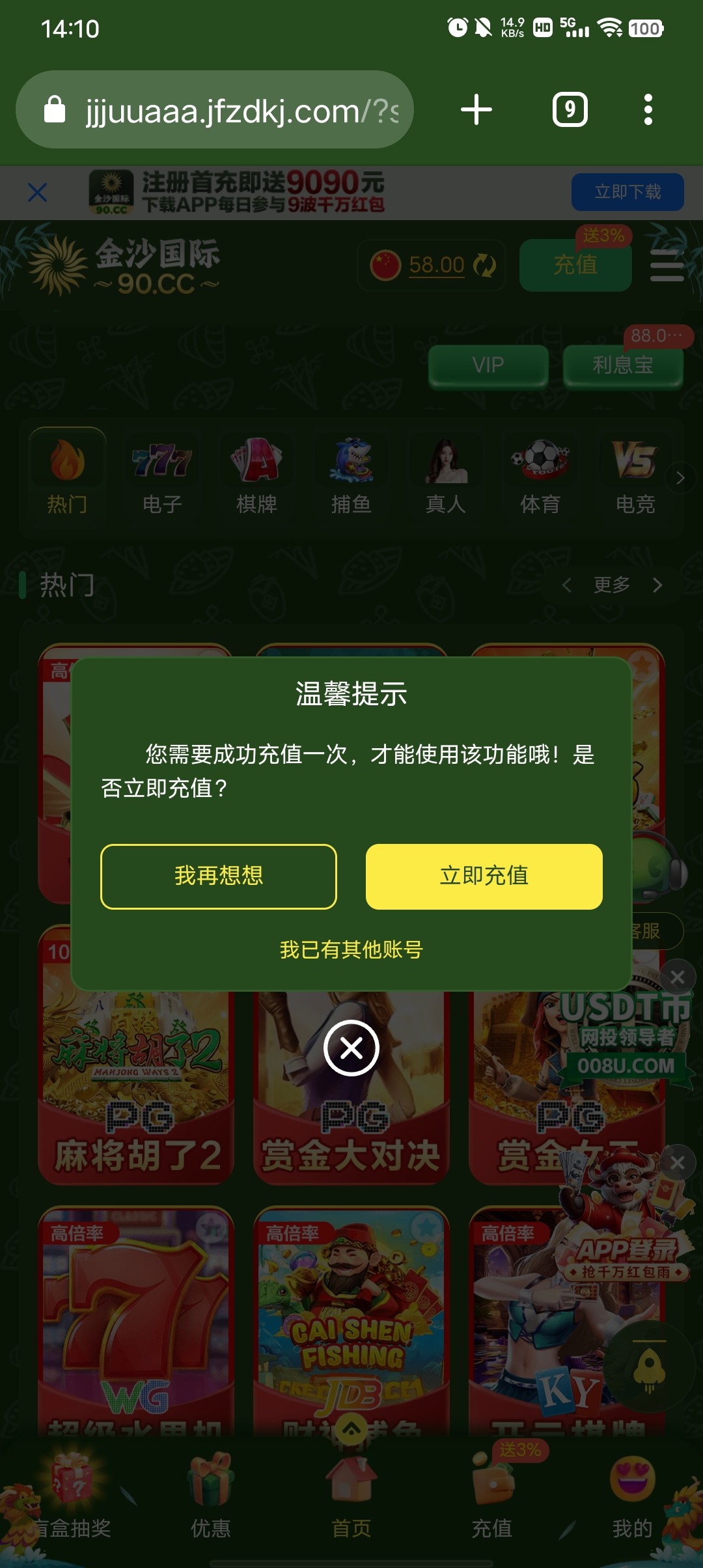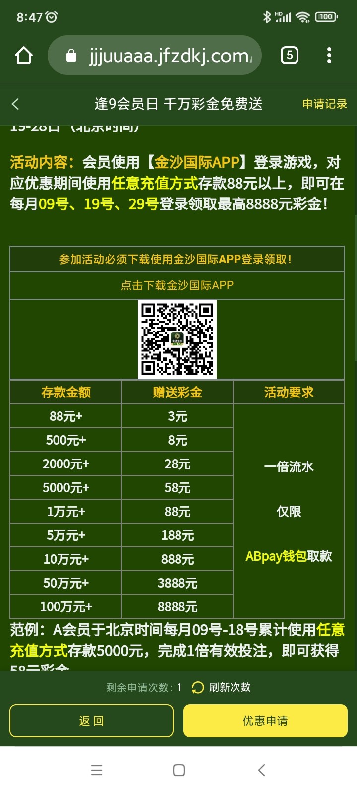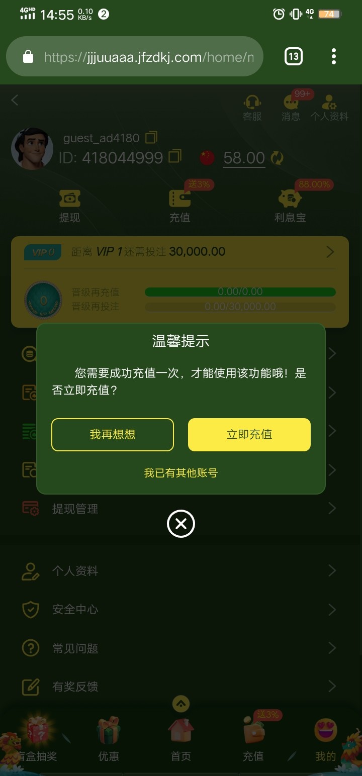 @zqx1982 ,你说的这个是明天领的,贴主发的是类似于幸运奖,我也领了28,但是前提是要充值过,充的越多提的越多。这个台子目测活不长,不建议玩。我在他们另外一个平台就10天没充值直接封优惠了