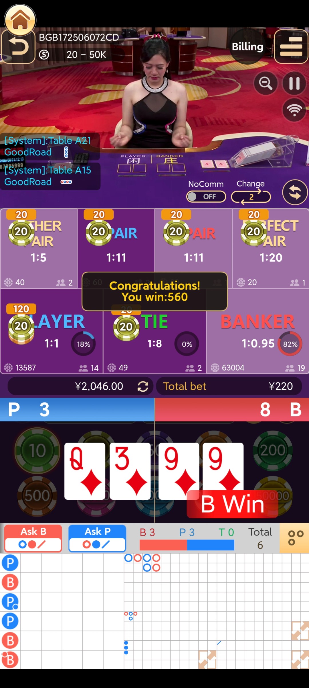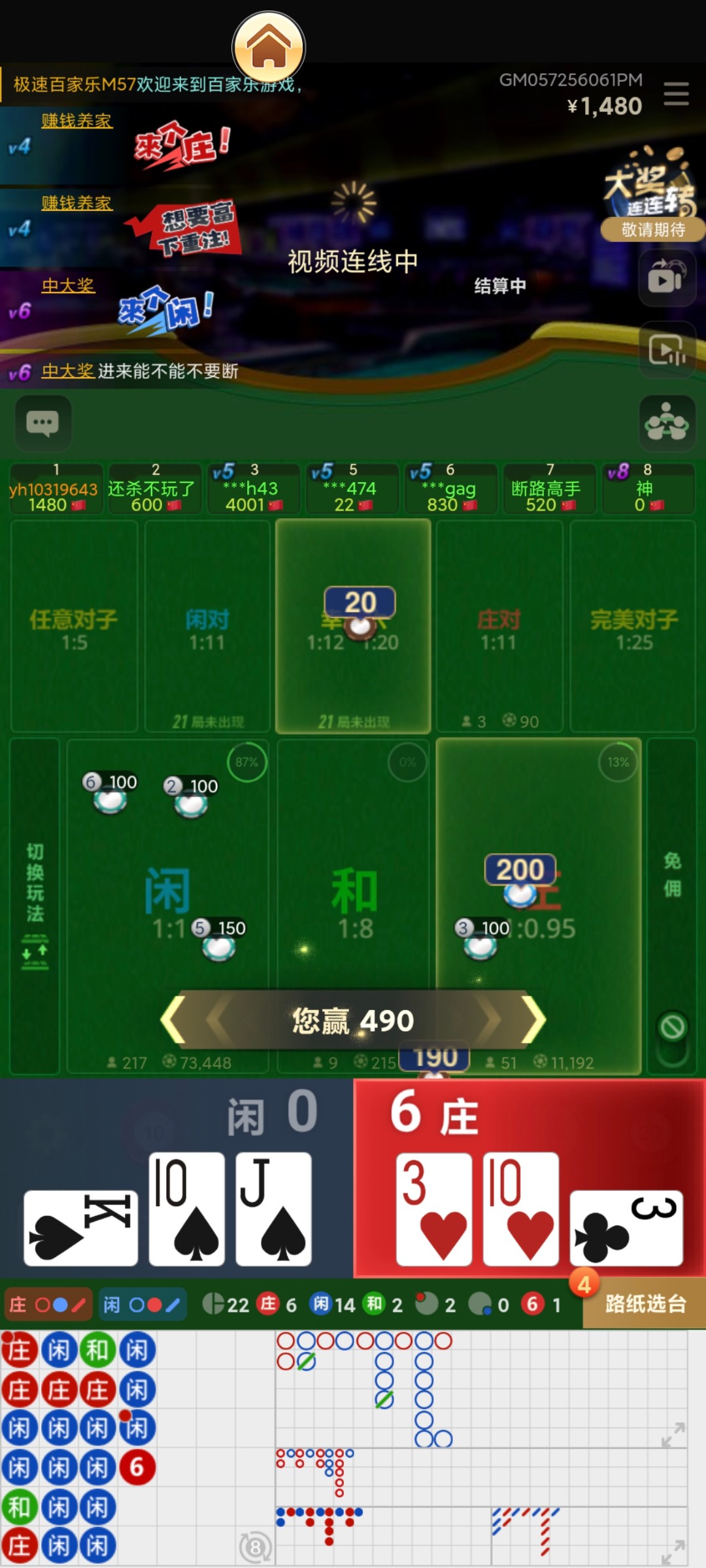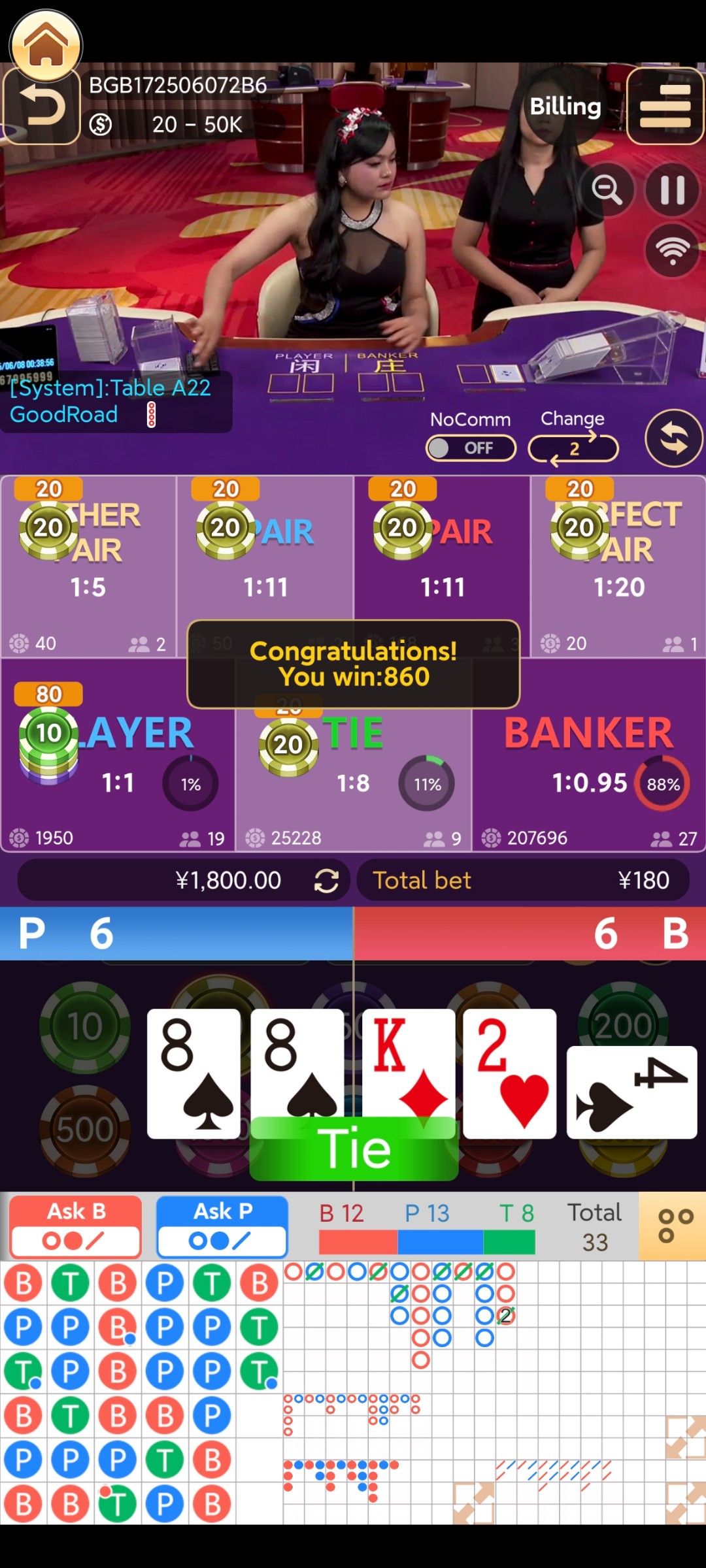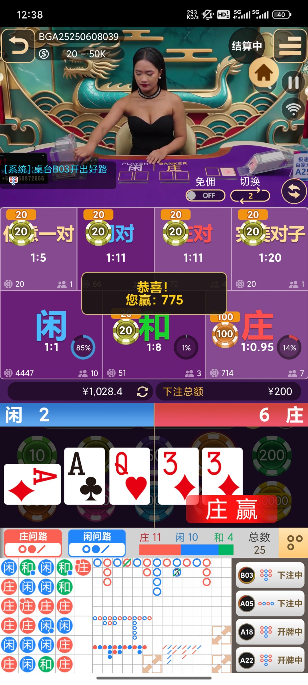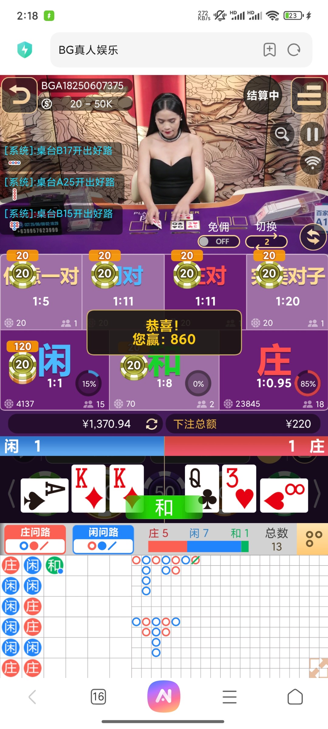 有的台子是开了和之后就有对子以及超级6啥的,虽然不是很稳但有时候真的可以压一压(单纯红蓝现在越来越难赢)也可以去pa(ag)刚开始开的路子盘里面去买超和(一般10多手左右有)小数0-5左右的