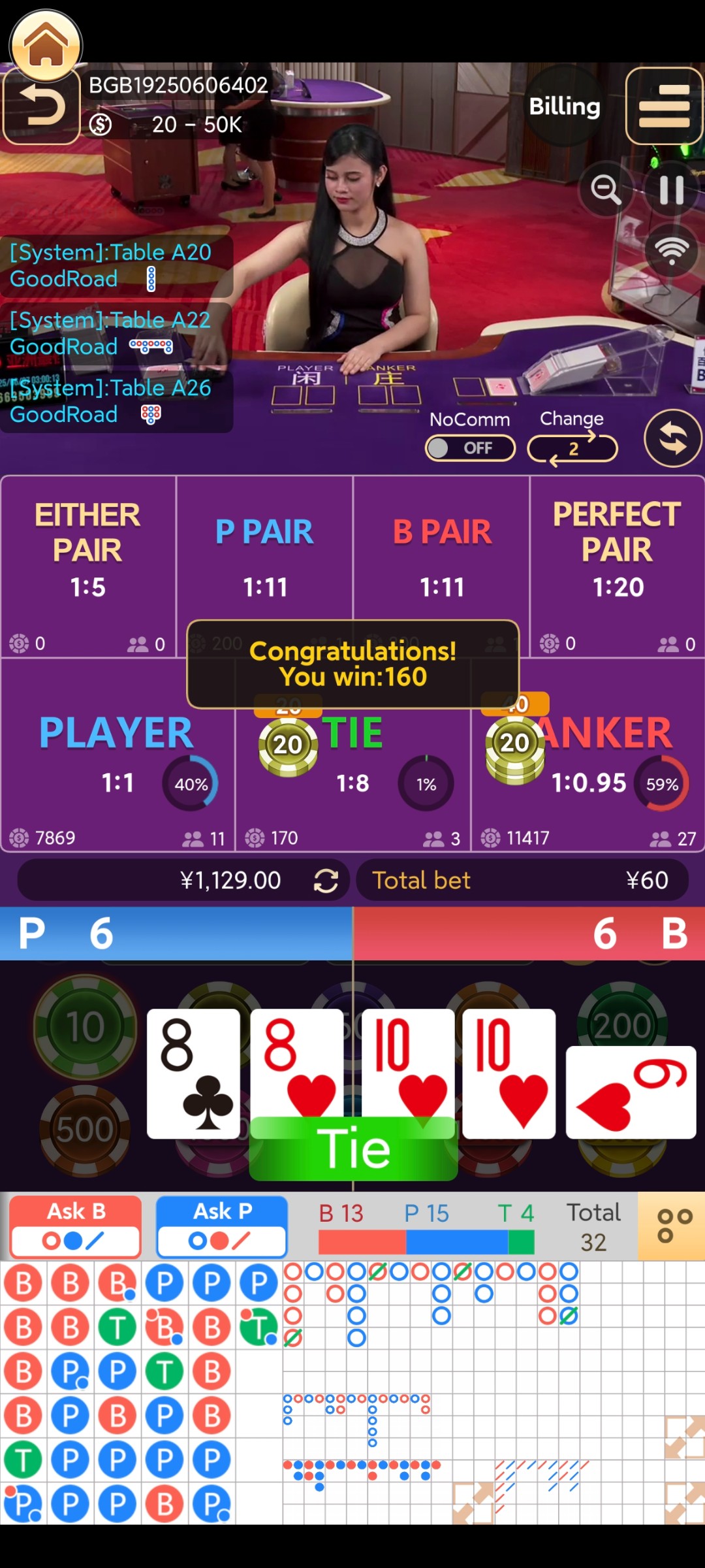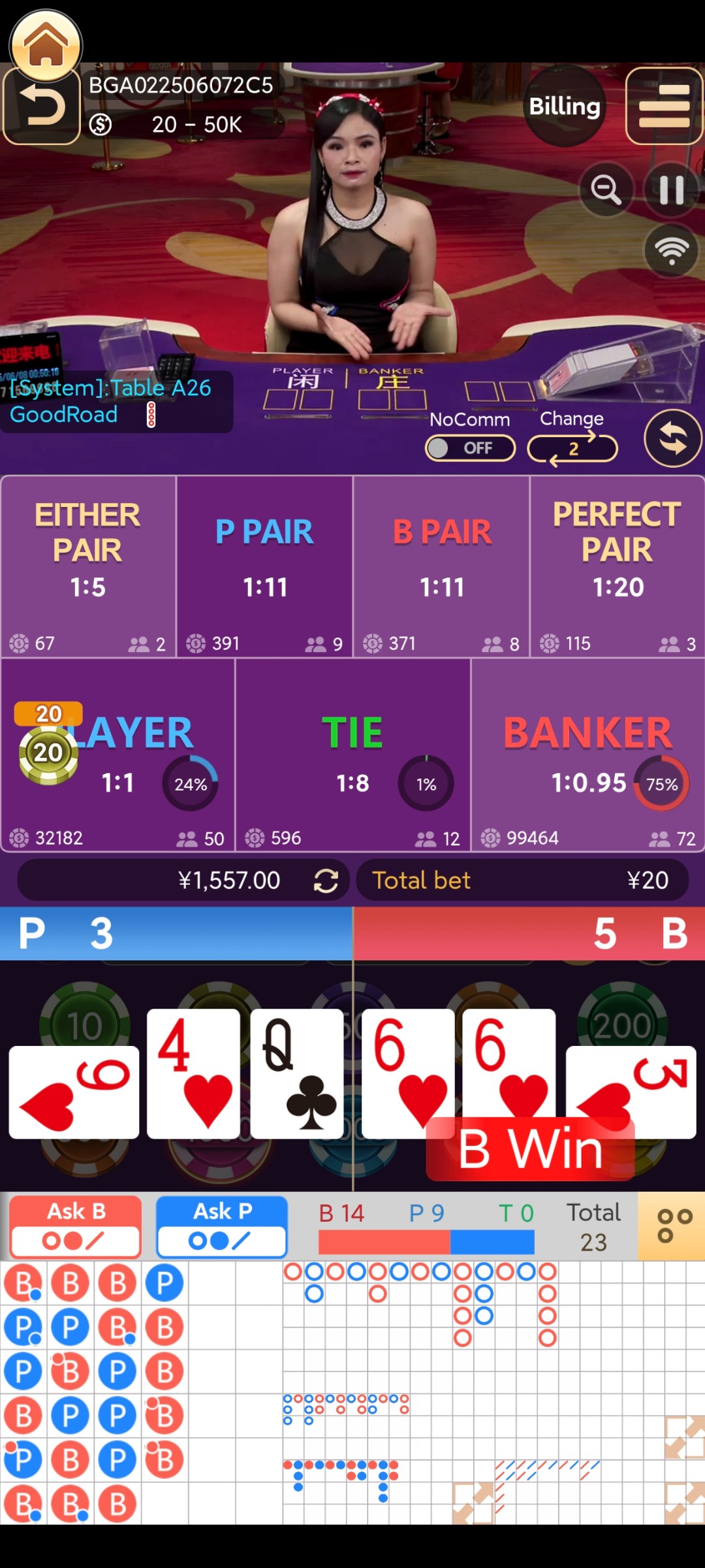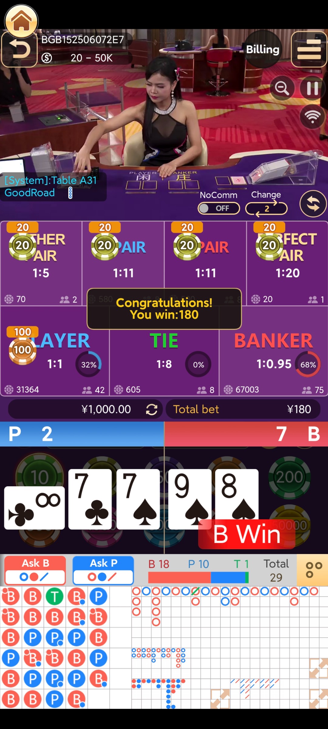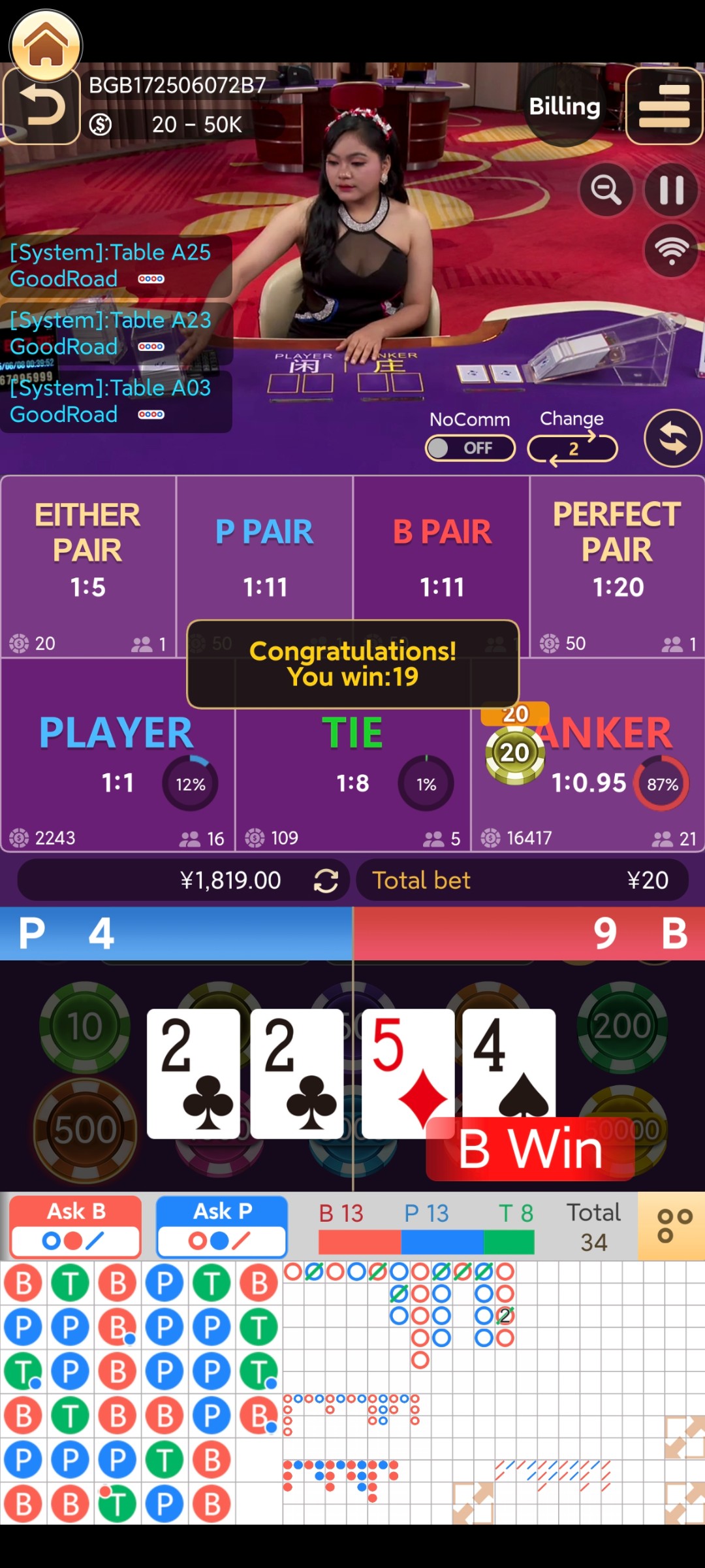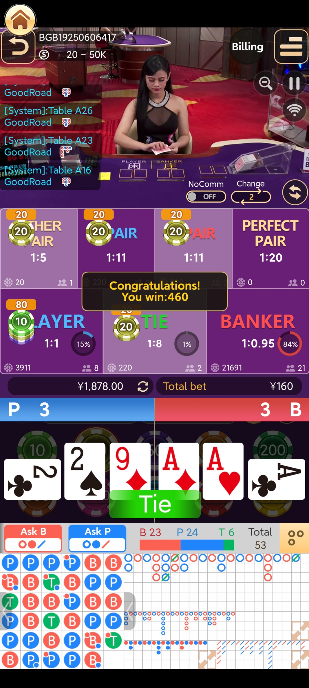 有的台子是开了和之后就有对子以及超级6啥的,虽然不是很稳但有时候真的可以压一压(单纯红蓝现在越来越难赢)也可以去pa(ag)刚开始开的路子盘里面去买超和(一般10多手左右有)小数0-5左右的