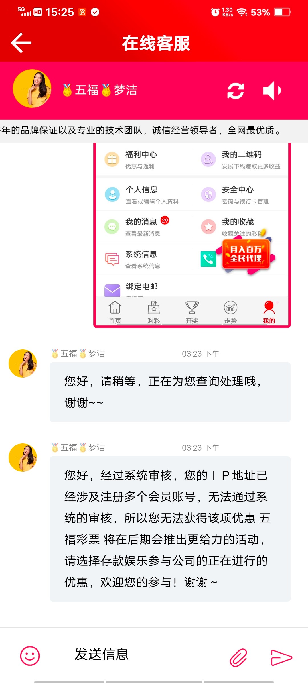 我之前彩票充50赢了7000叫我打流水本来赢两百他不让