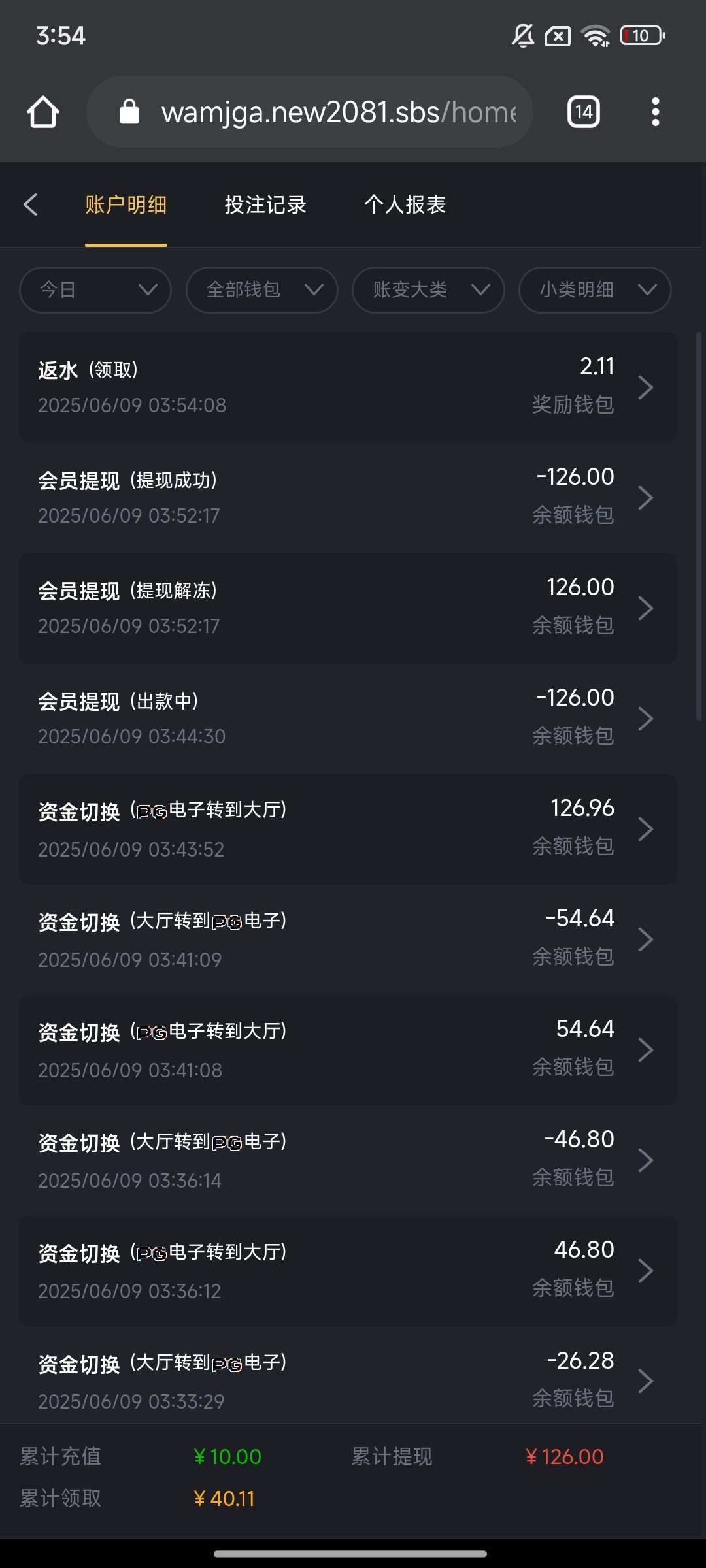 我打过,我充了10,慢慢2毛磨流水,提了120