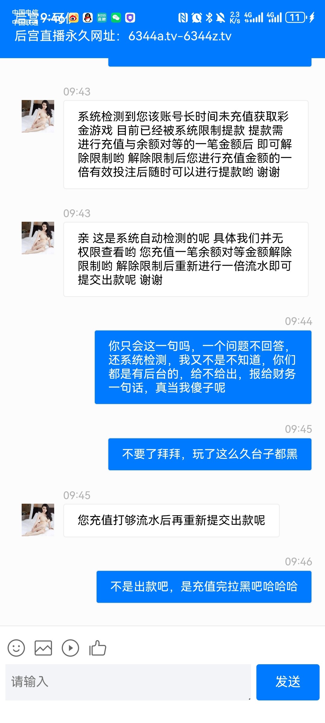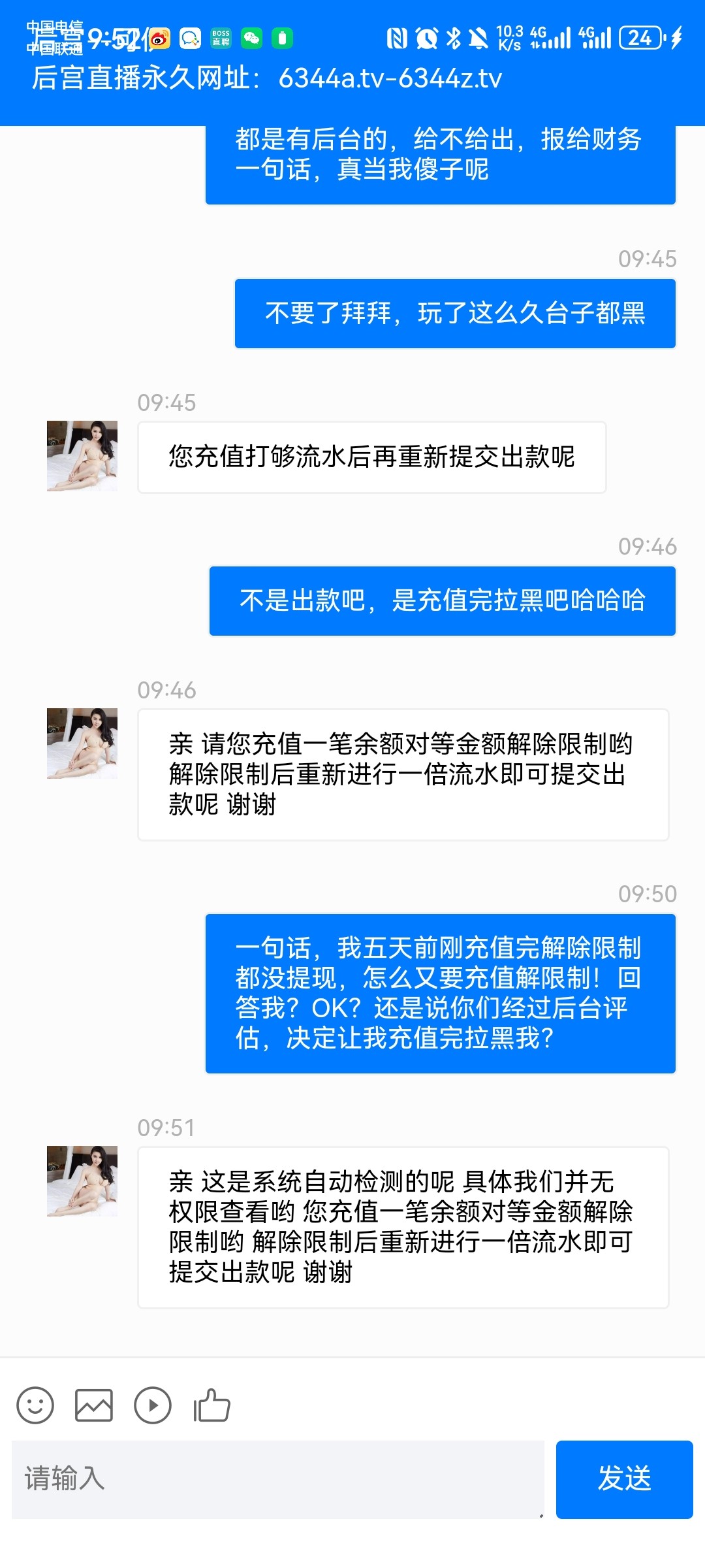 这台子之前输了几万,因为黄渤名声一直不好,就差不多一年没充值了,前几天提现也要说充值一杯出款,当时我充了结果洗白了,这次我用10块钱周彩打到了1200,距离上次充值五天不到,又要充值,这是傻逼一样,果然黄渤不是一般的恶心,让他狗日的拉黑我,永远只有一句,充值余额同等金额一倍出款