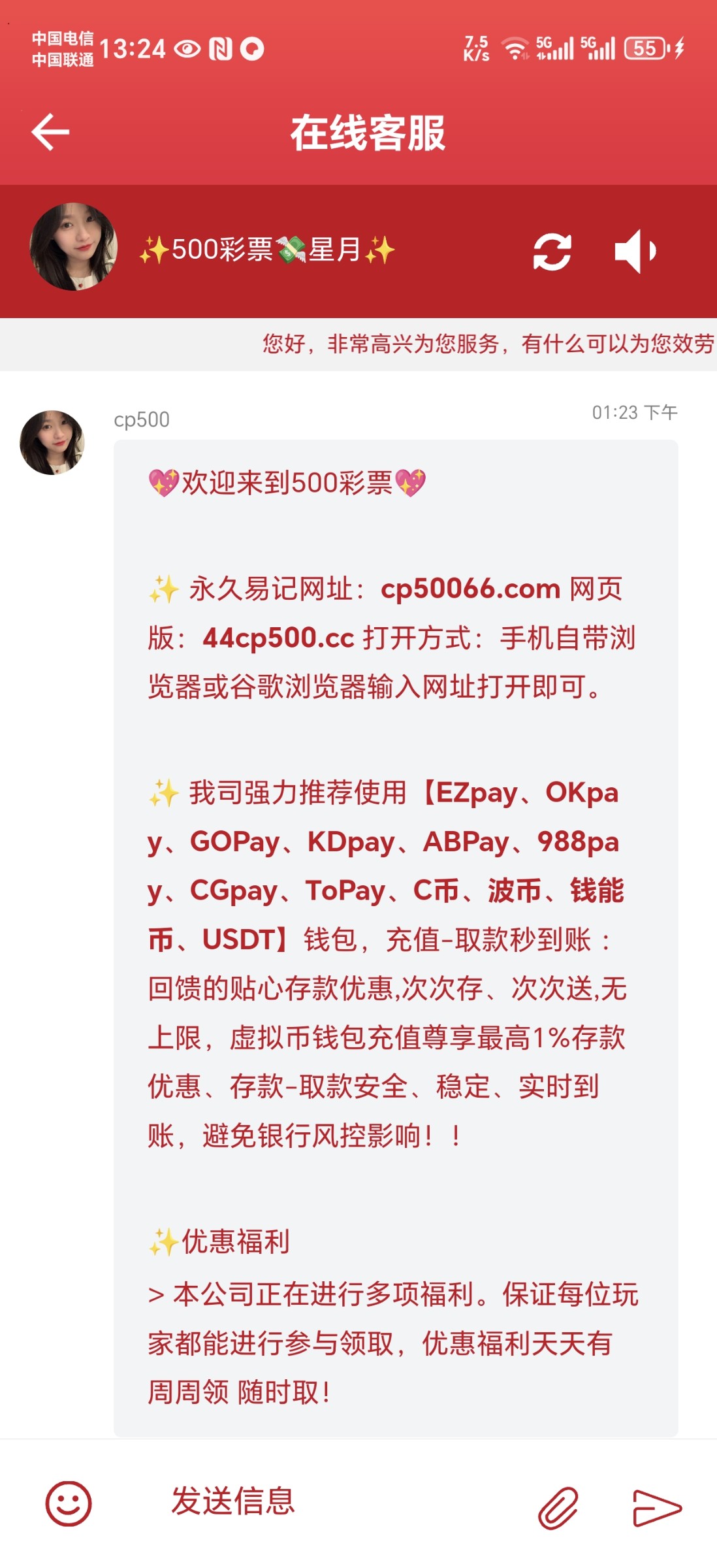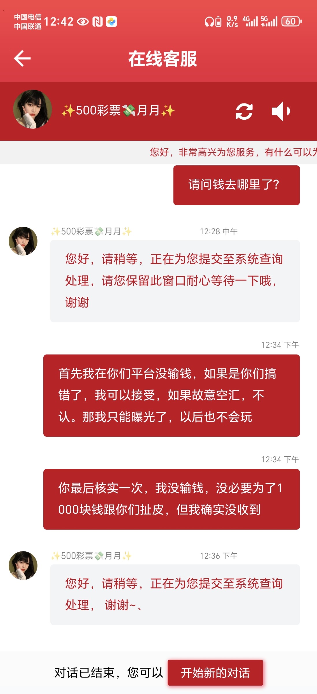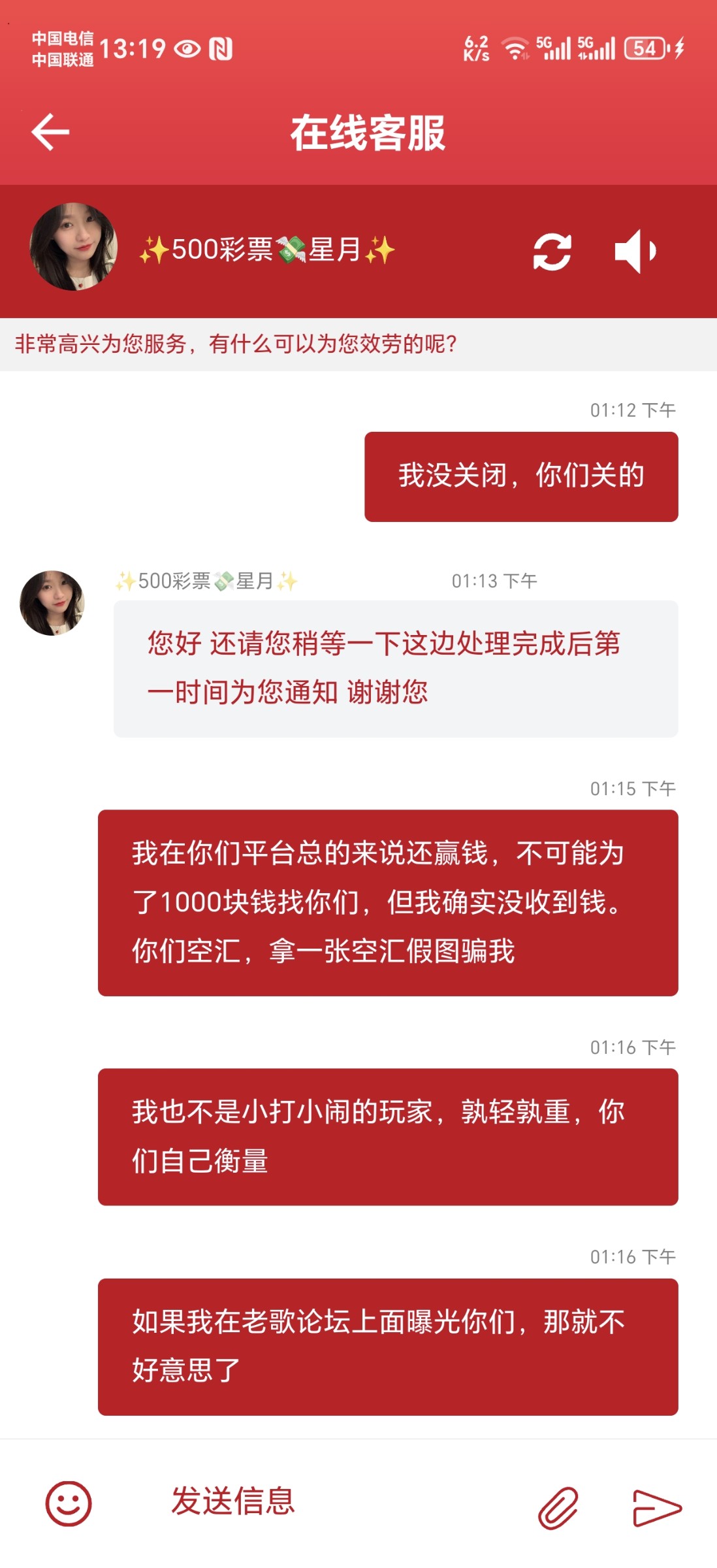 我这段时间在这平台上玩,开始输了4万多,这两天赢回来了,还多赢了8000左右,一次出过10000,但今天空汇1001元,大家在玩500彩票要注意了,客服就甩一张打款到支付宝的图片我,但我确实没收到钱,我说你这图片可以假,客服没回,一会就结束对话了,再进去又换了客服,现在平台都这么玩不起了吗?500