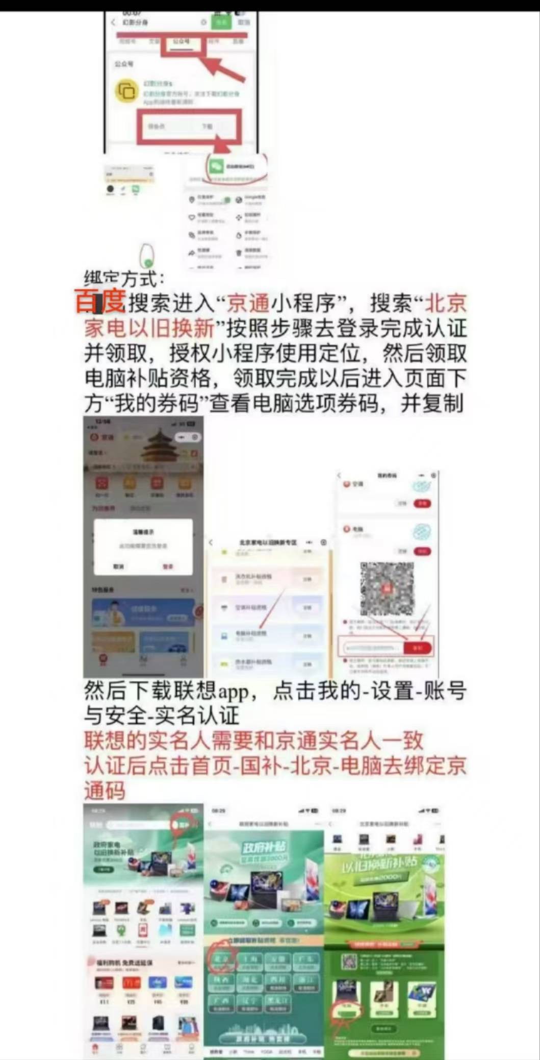 人人能领80~200第一步用微信打开京通进去登录了 第二步用幻影分身把自己的微信地址改到北京(北京任意地方)然后再用分身微信进入京通里面有个北京以旧换新活动 点击领取家电里面的电脑卷复制卷码 第三步下载联想然后去绑定自己的卷 去闲鱼然后挂京通联想卷一般都是80以上 低于80别卖市场价现在150左右一张