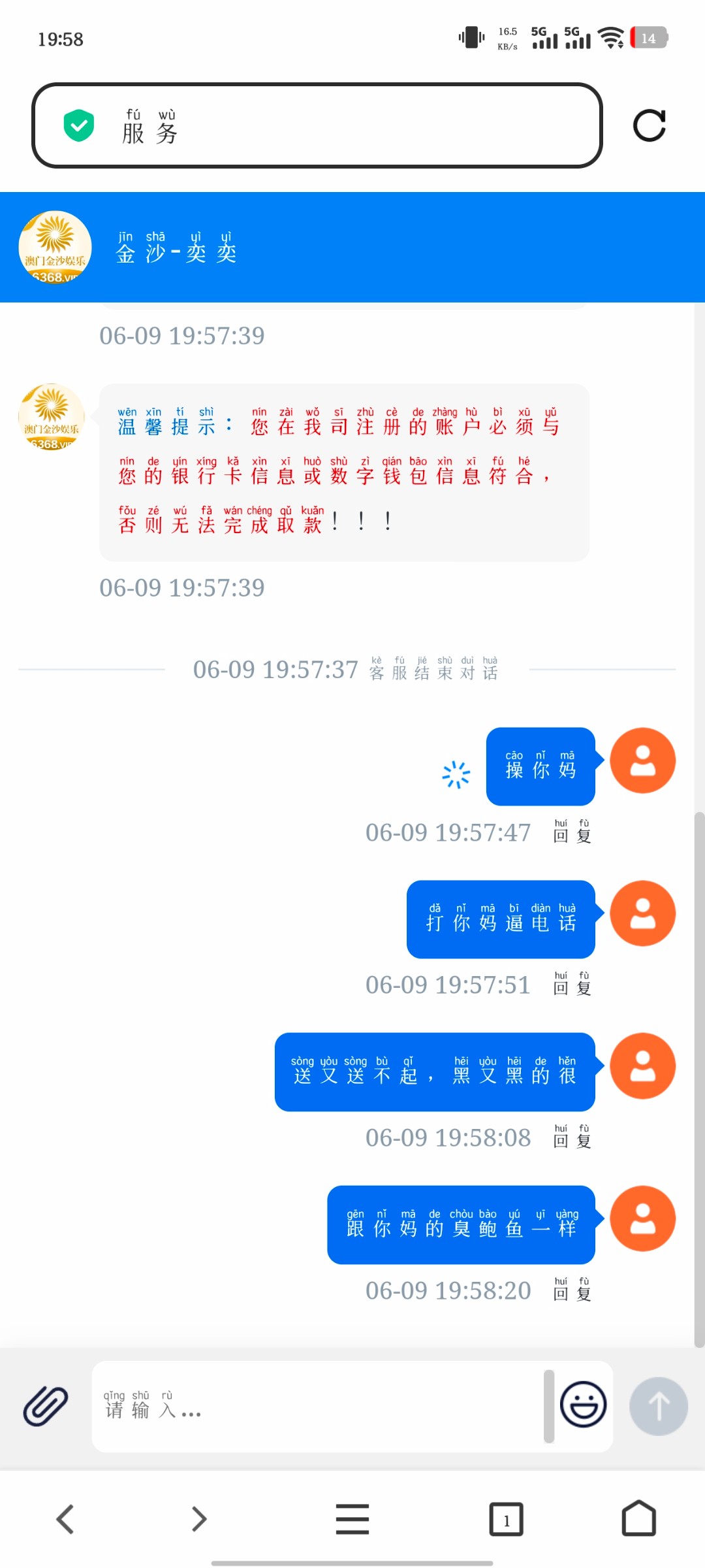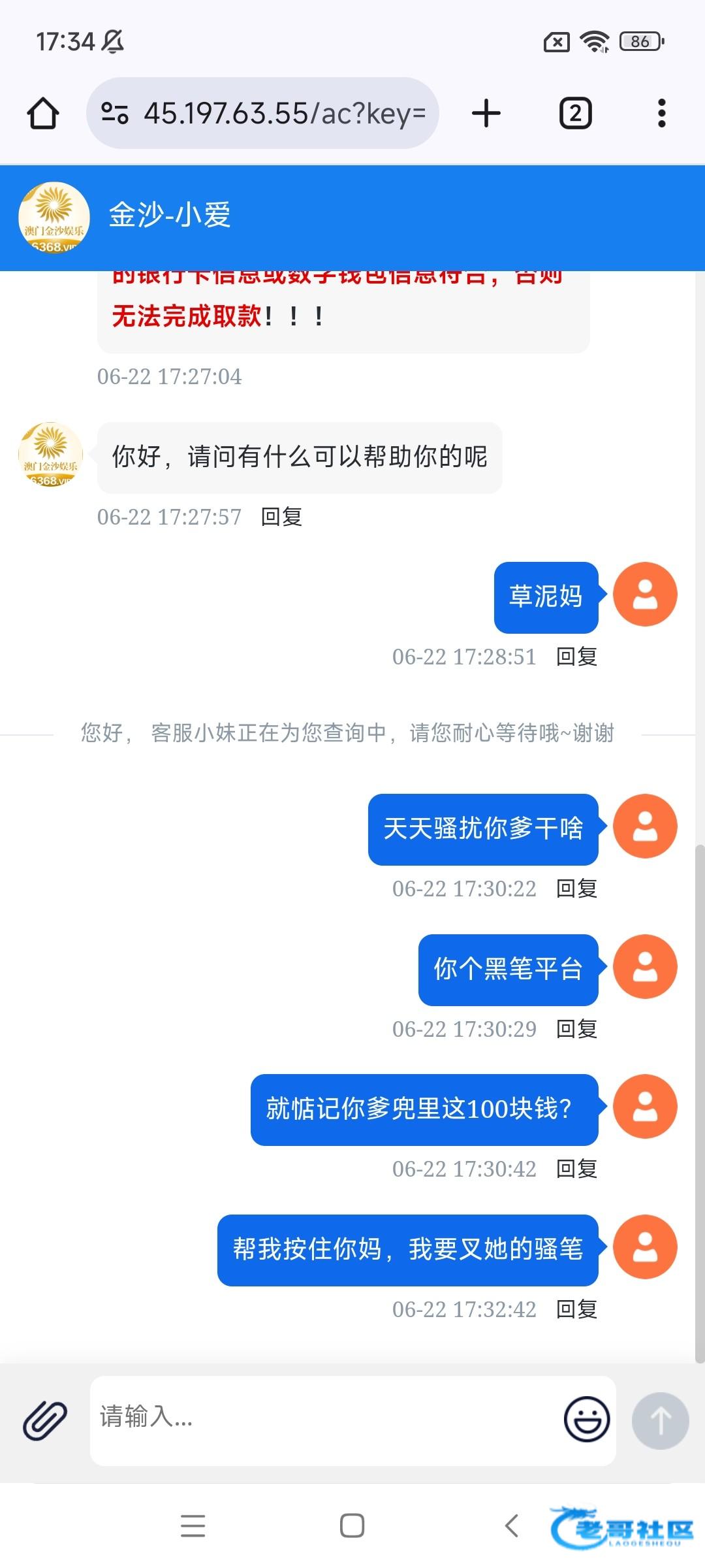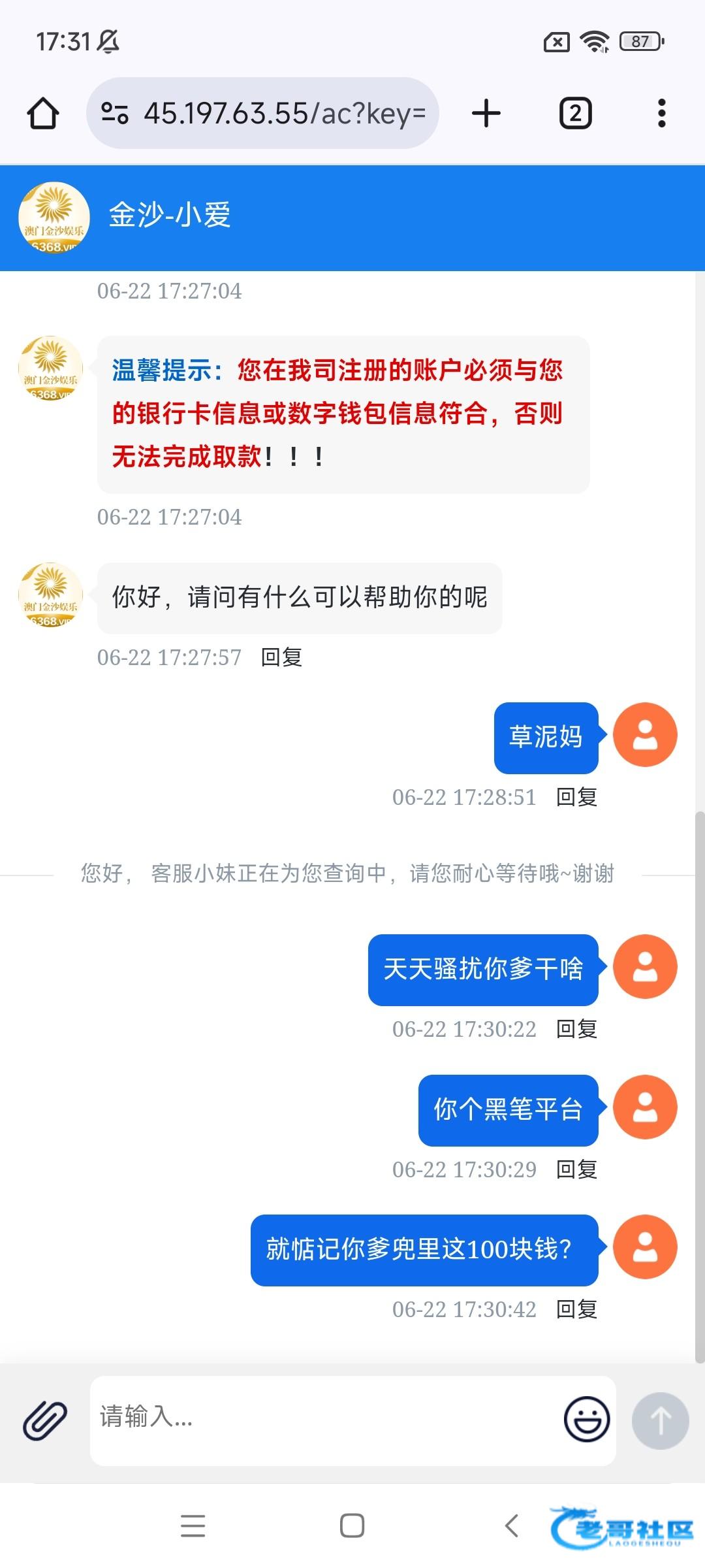 ,说回访送88,一打开就是个客服页面,一直让下载APP,下载以后就让你他妈充值,让你充100送88,后面我想了一下,好像之前也接过这个电话,当时说的是注册送88,最近这种套路台特别多,都是骗注册的,老哥们接到注意一下