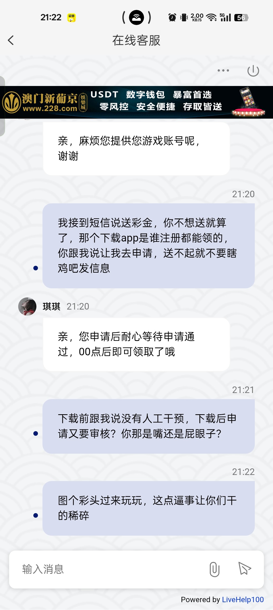 妈个逼的给我发信息,说凭短信截图找在线客服送彩金,我去找在线客服煞笔跟我说下载app去申请下载app的彩金,说没有人工干预,那个就是特邀彩金,我想本来也没充值,有送就挺好,我去下载后申请,提示又要审核,没有人工干预谁审核?狗逼审核?再说了下载app的彩金谁都能申请,还要打够666流水,才能获得10元提现额度,再邀请一个新人充值50才给100提现额度,我给煞笔在线客服骂了,艹他妈的,什么煞笔都有!