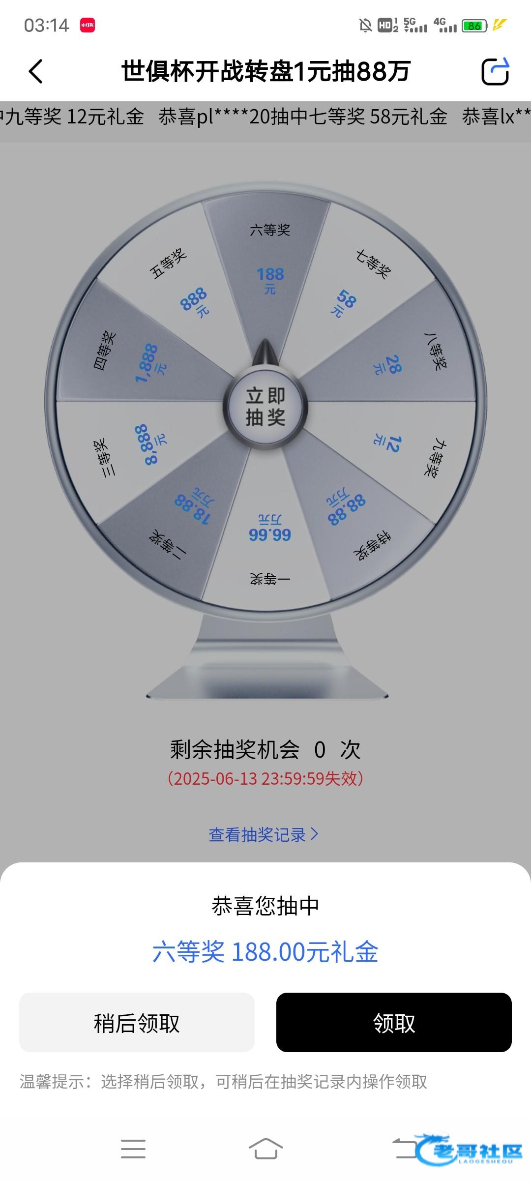 6月13开始,一元投注大转盘抽彩金。网址就是博系名字就能打开。账户有5毛钱即可刷够流水,选择 平台彩票, 即开彩极速赛车。单注选择1厘 冠军2345亚军6789季军67910 连续开奖80次即可够流水。余额仅需要0.5元亲测。投注详情如图。