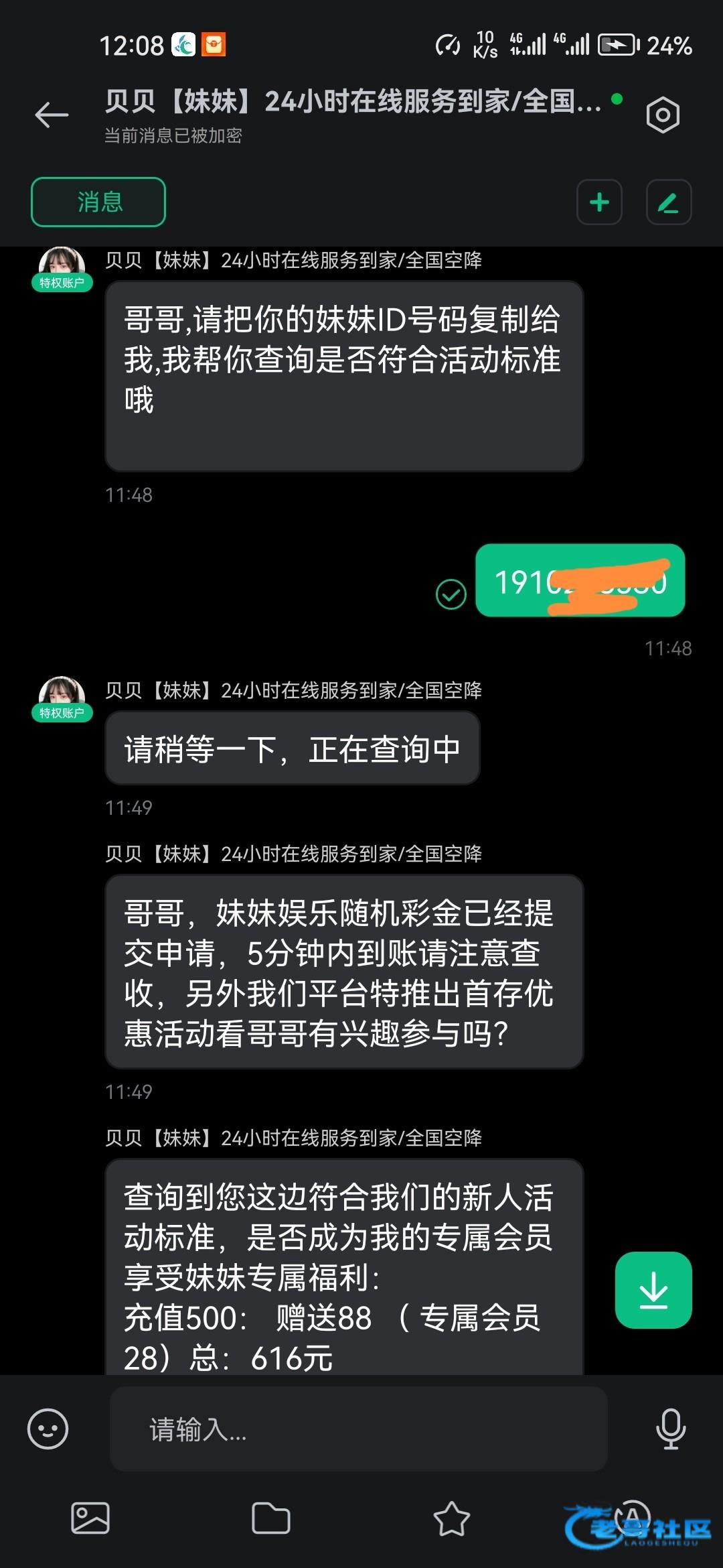 刚接到电话说送彩金,让下载了风信子聊天软件,服务器112244,自动添加客服,跟他说接到电话来的,要了妹妹直播ID,没充值过,送了8.8,打出来了100