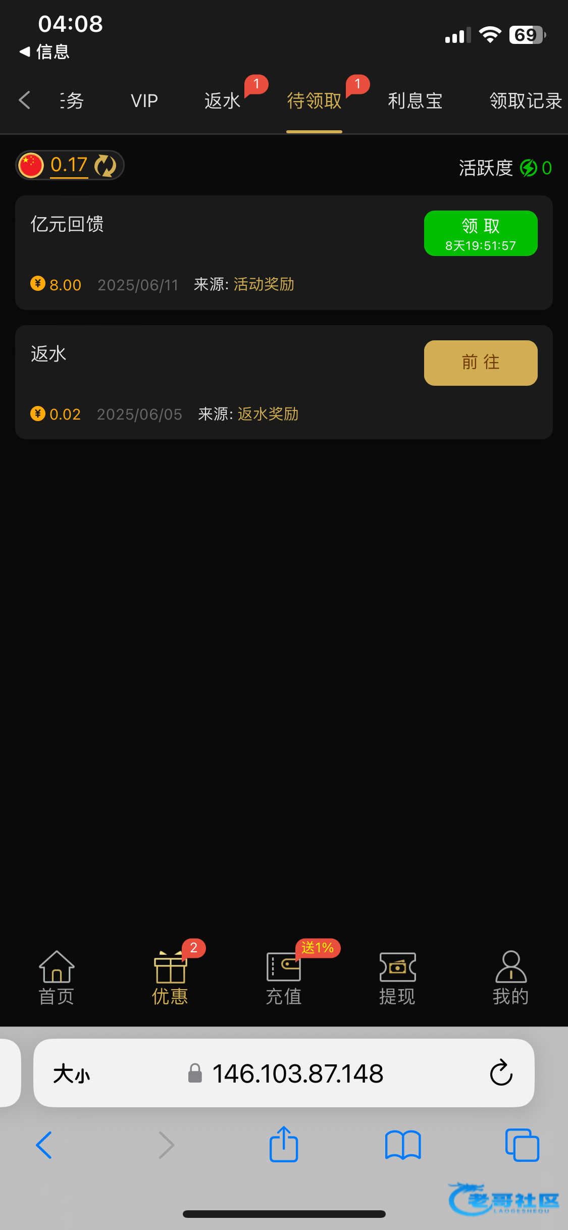 网址是:https://wy7.top/normal/ (他还有一个优惠活动下载那个聊天软件也送18到1088不等 但是要有历史充值记录) 之前很多老哥都弄过了就无视