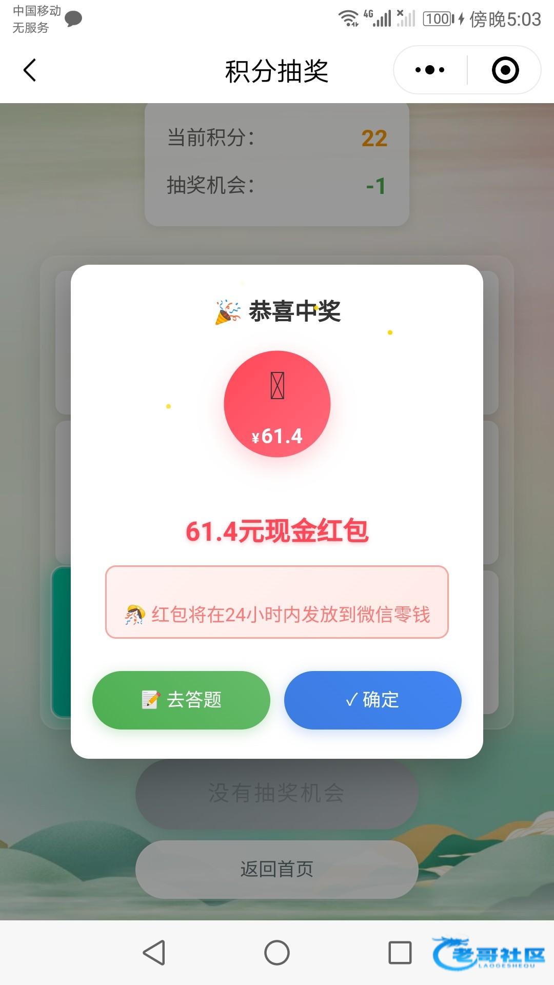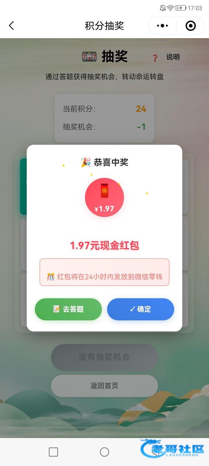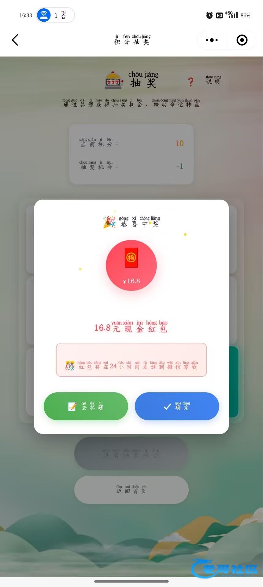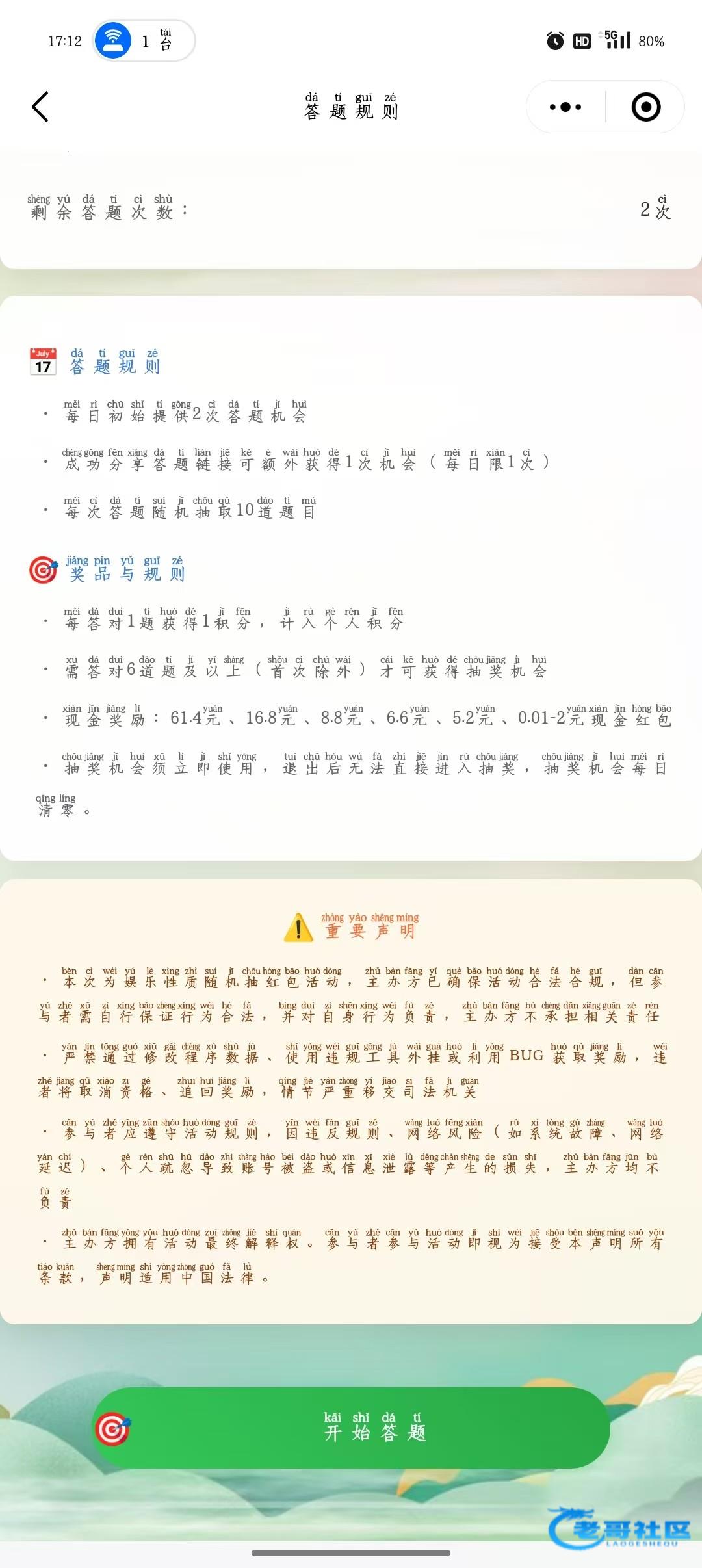 谢谢老哥,中了大包,不知道会不会发放。确实很卡,一会儿显示登录失败,一会儿显示活动未开始,等了很久才进去,10道题需要答对6题才能抽,我刚好6题