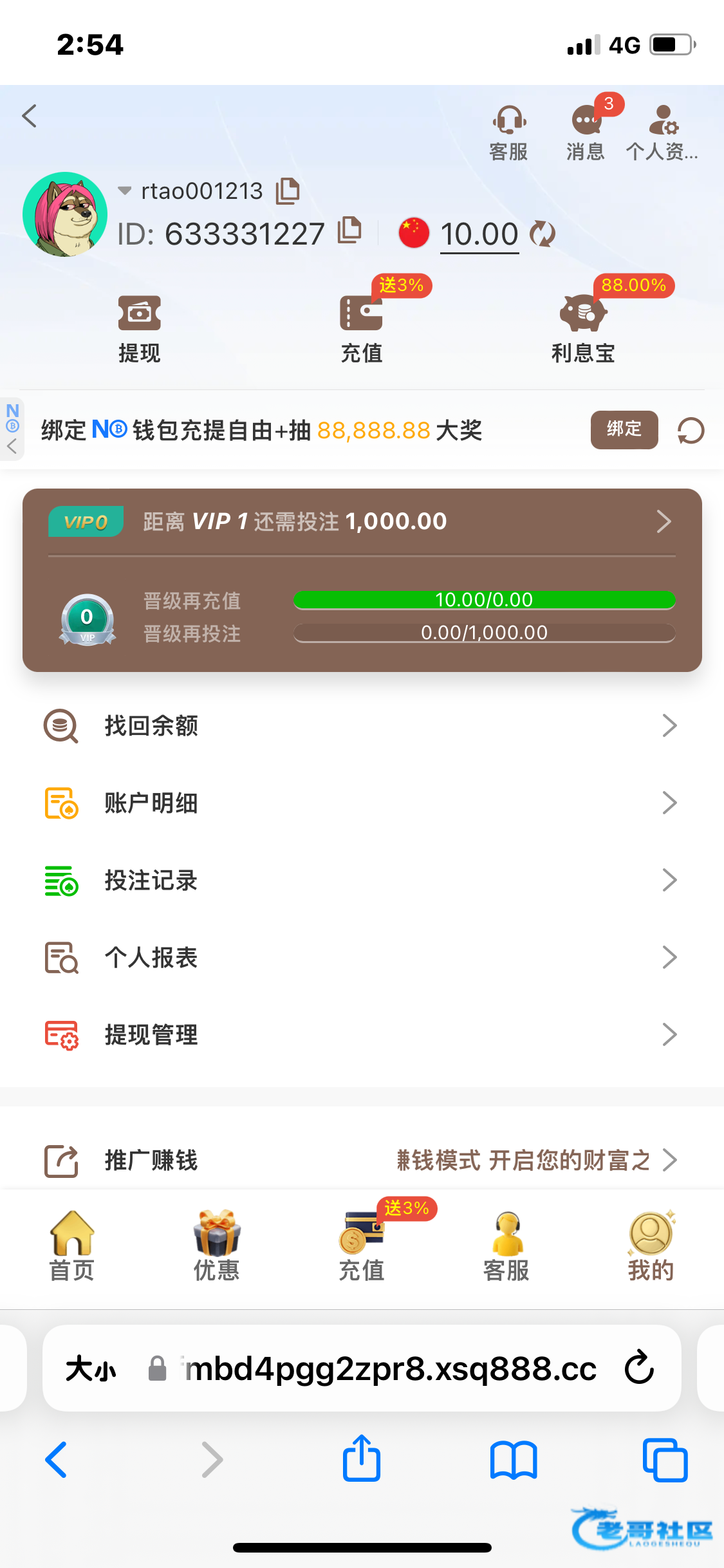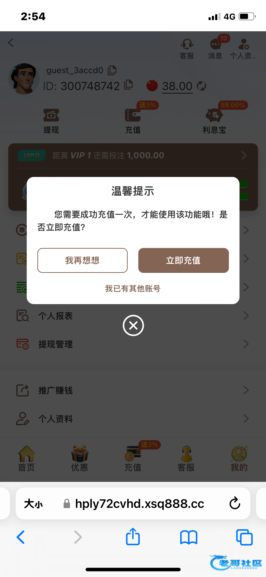我点链接进去一看有38,要充值才能玩,看通道有10块可以冲,就试了试,结果就变成10了,套路深啊我要回农村,客服都没有,大家碰到注意一下