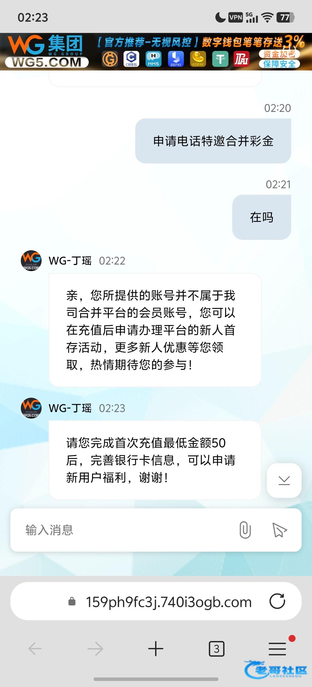不知道哪个台子合并的 我是接到电话的是个人机 找在线客服就说接到电话来领合并彩金他会给你个pop客服去加就好了我反正是挂了 前几天接到的忘记发了 wg5.com
