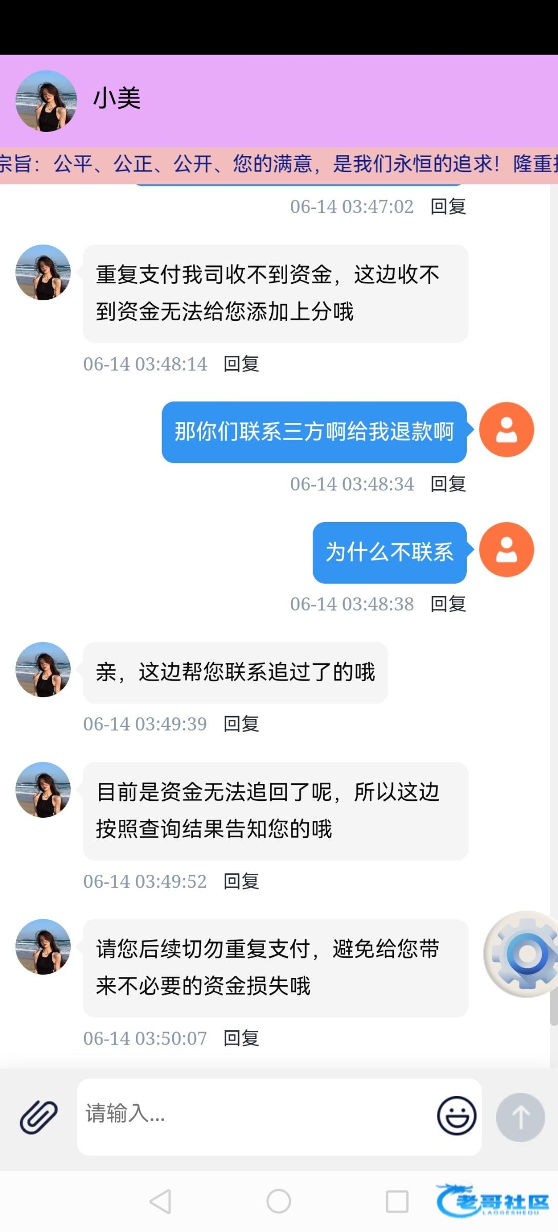 说他们三方收不到钱处理不了,我只是充值了第二笔,第一笔冲完了输了,冲第二笔那个二维没在相册更新慢了我就直接充了,客服处理四个小时,跟我说他们三方收不到钱,不处理自行承担 黑平台啊