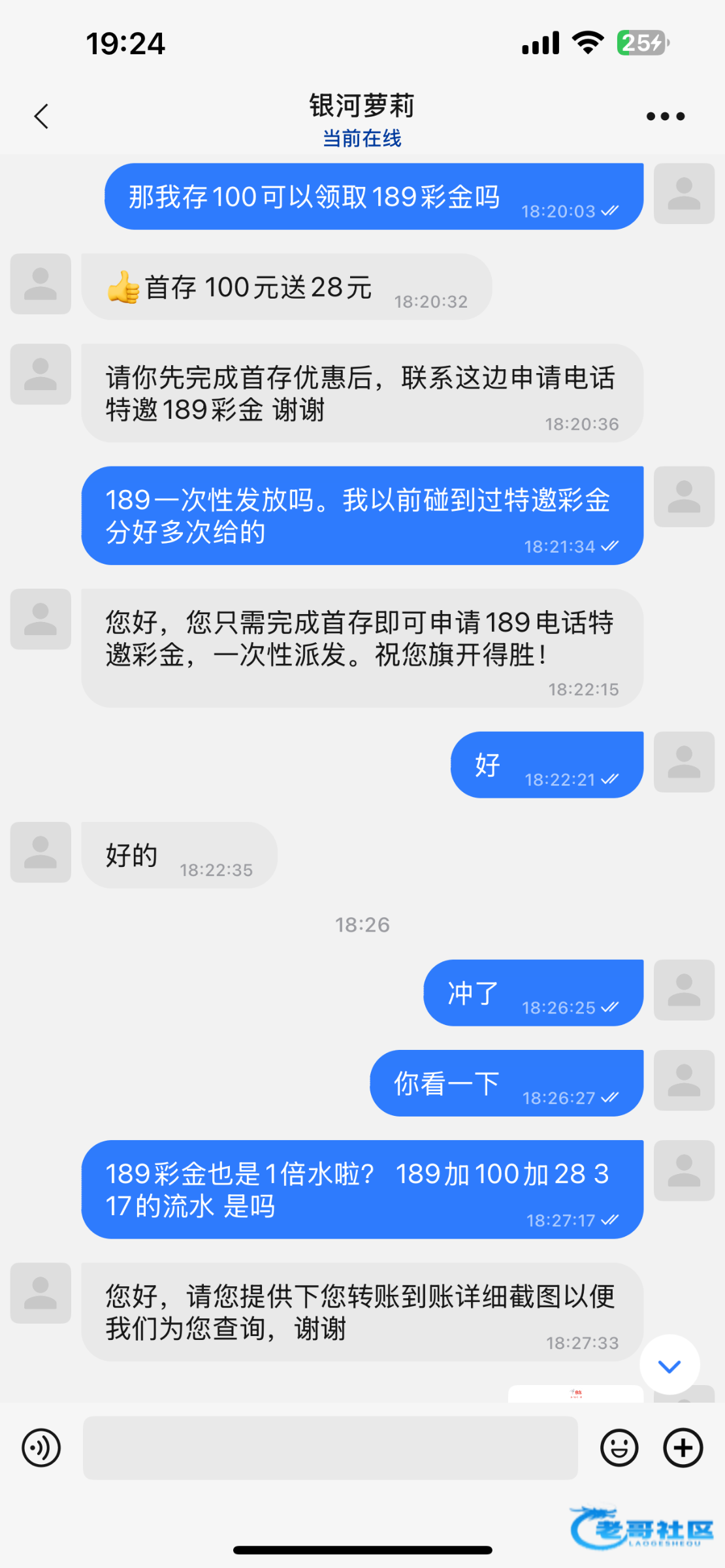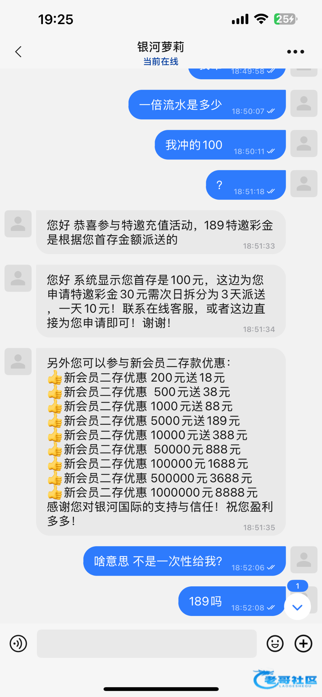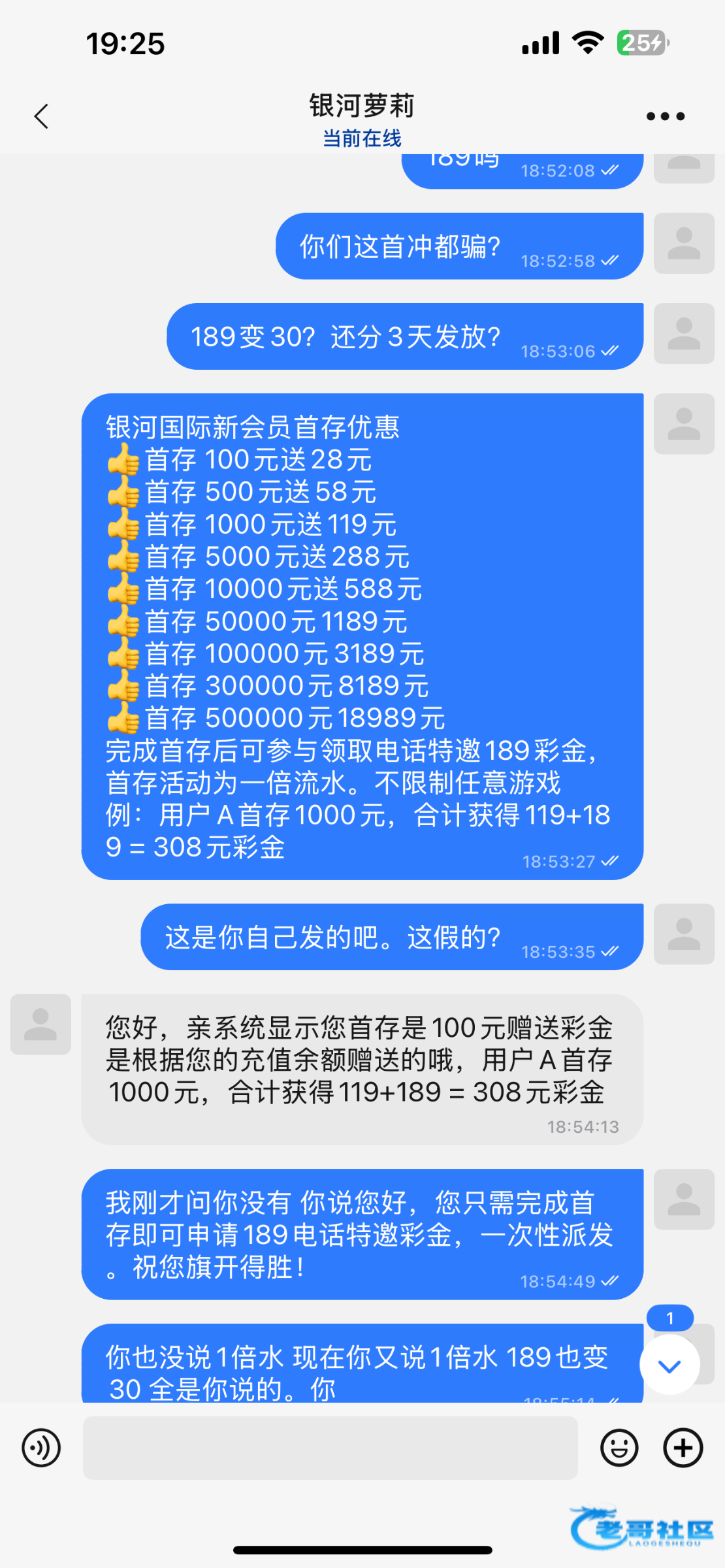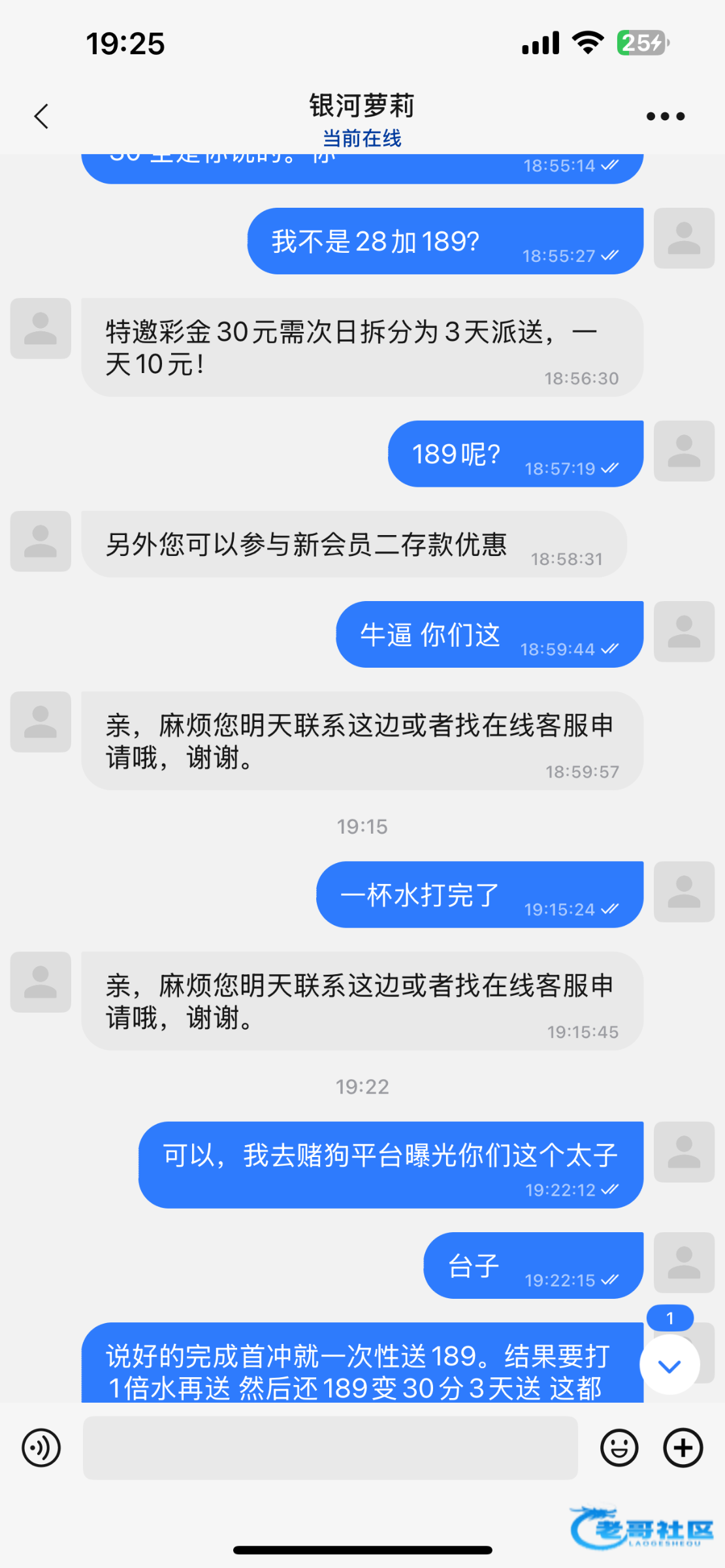 说好的完成首冲一次性送189彩金 变成还要打首冲1倍水 再变彩金30 分3天 1天10块 这么送 真恶心啊