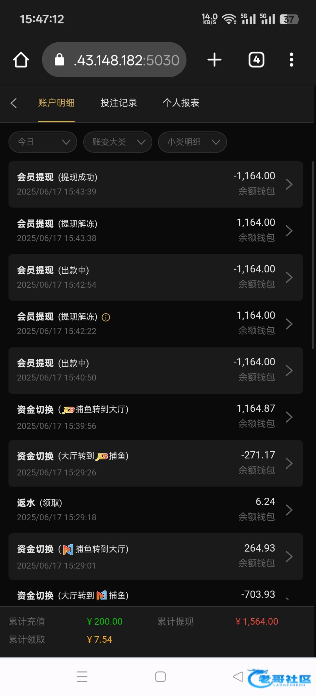 兄弟看了你的帖子我都佩服你了,一个劲的打电子。电子咋可能赢钱?我打都不打。你说的两个平台小额还是不黑