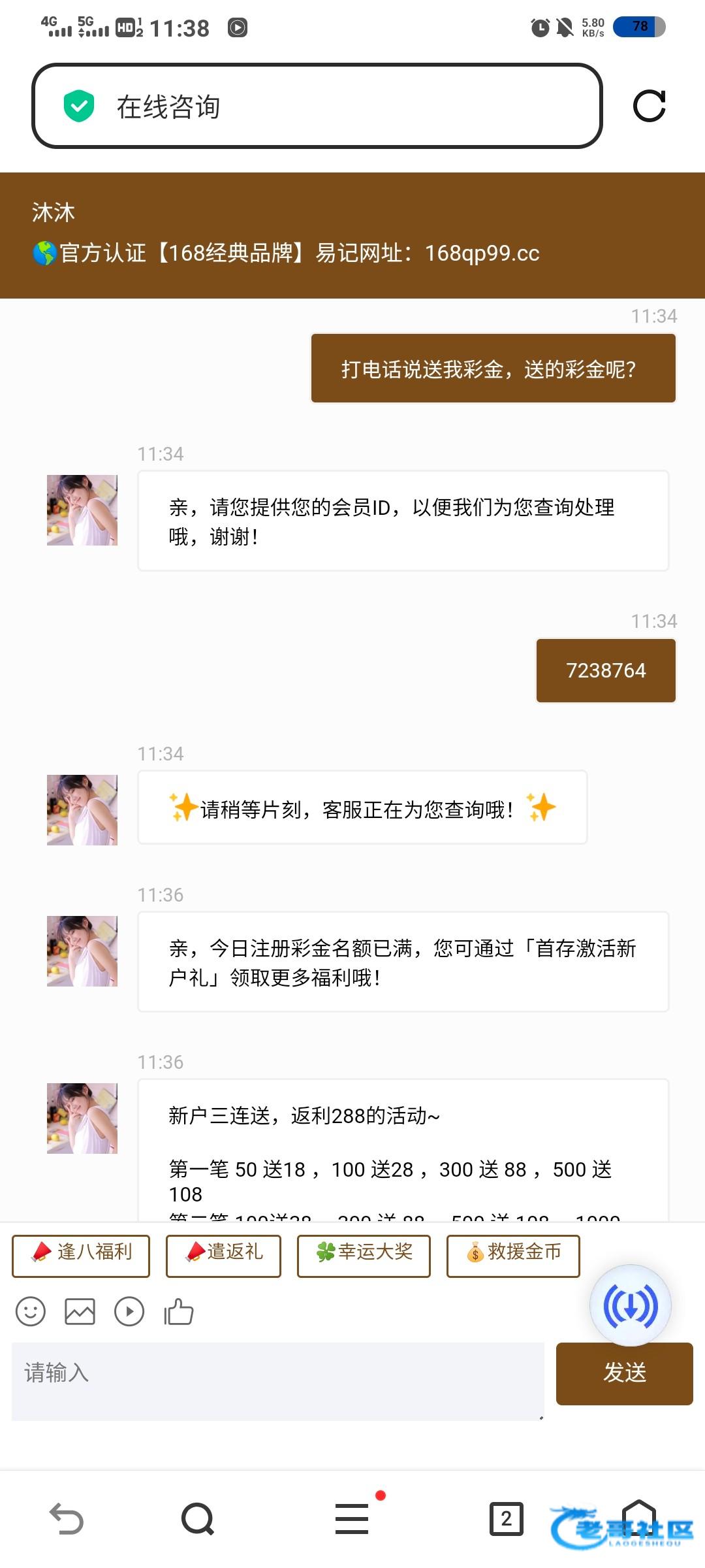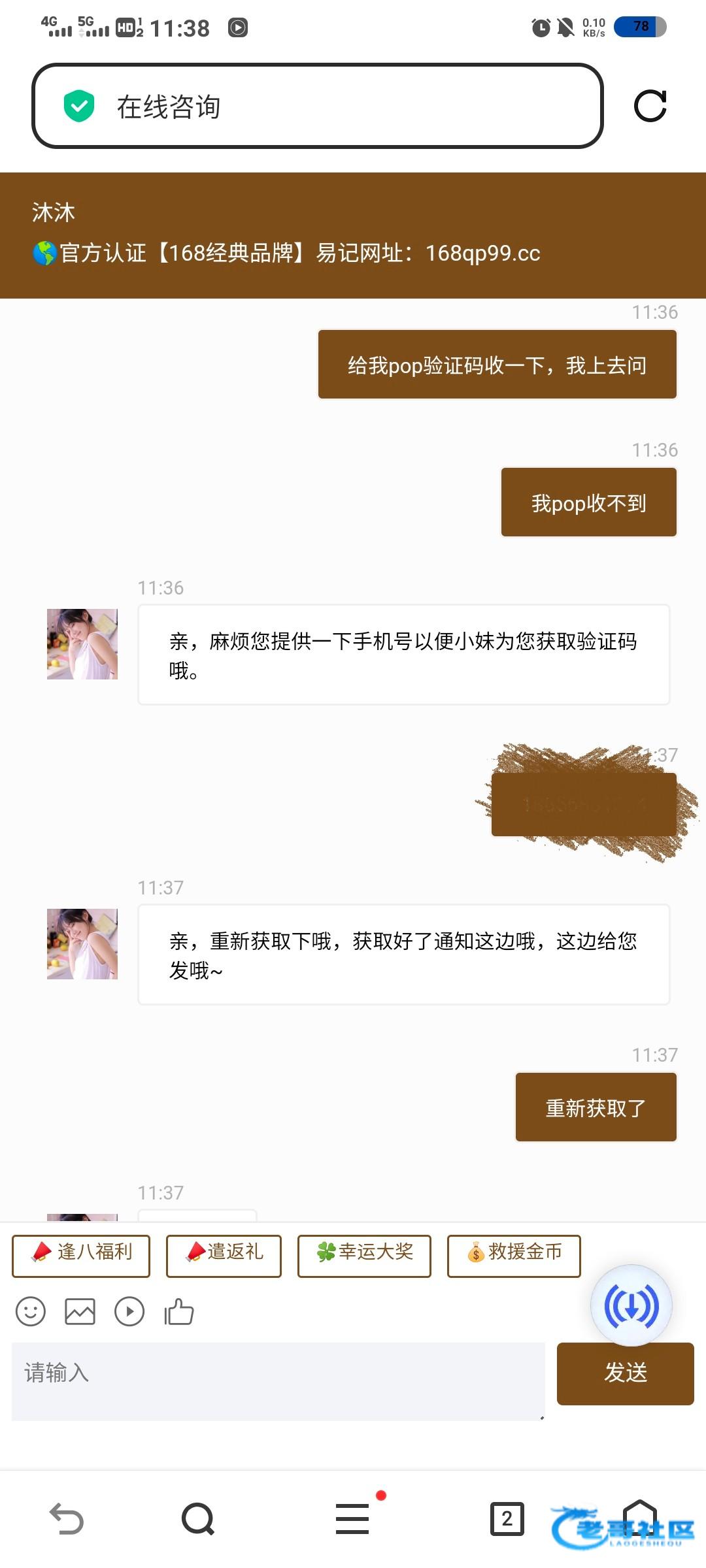 168棋牌客服可以收到验证码*网址1 68qp99.cc 上去就找他要验证码百分百不给,会让充值,所以要注意话术,忽悠!