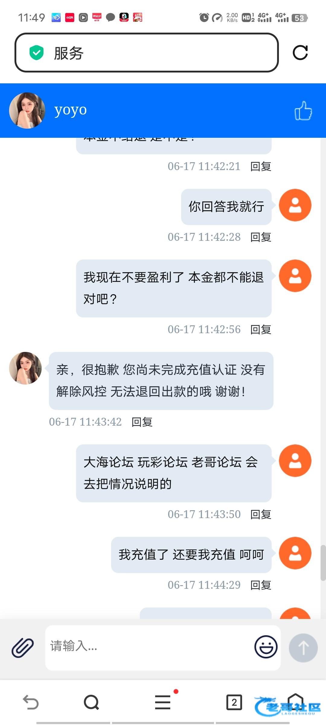 充值后提款,又让我充值500激活,本来上个月刚存了500.又让存款激活,我找客服沟通退本金,本金都不退。黑台。我已经让我朋友都不玩了 ,各位老哥以后都别玩这个台子了!一毛钱都别冲给他!后
