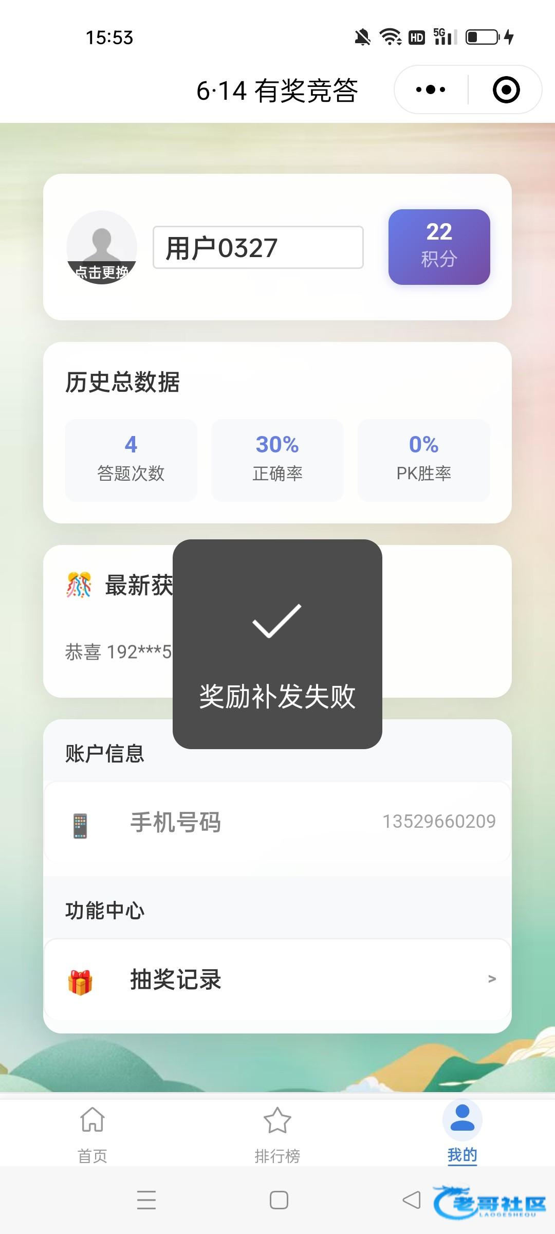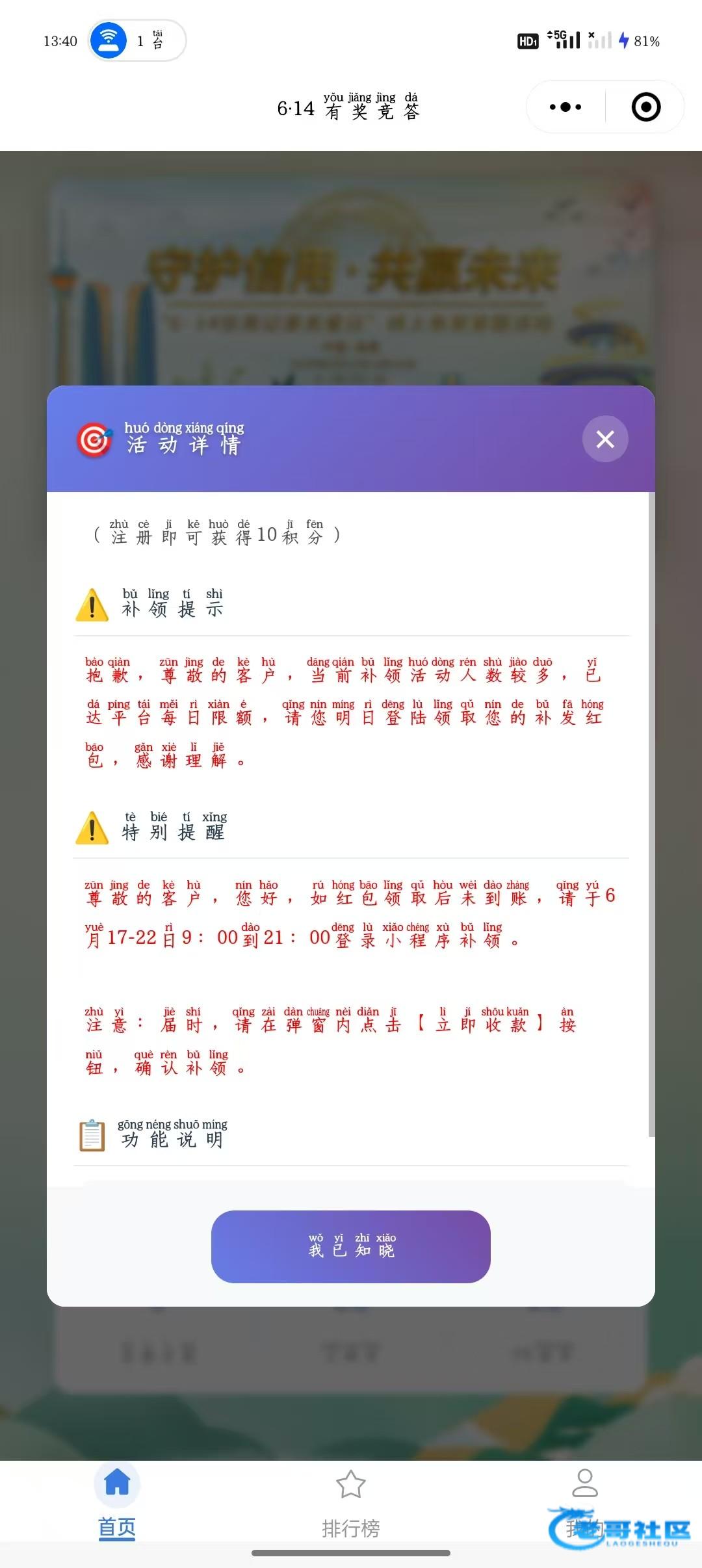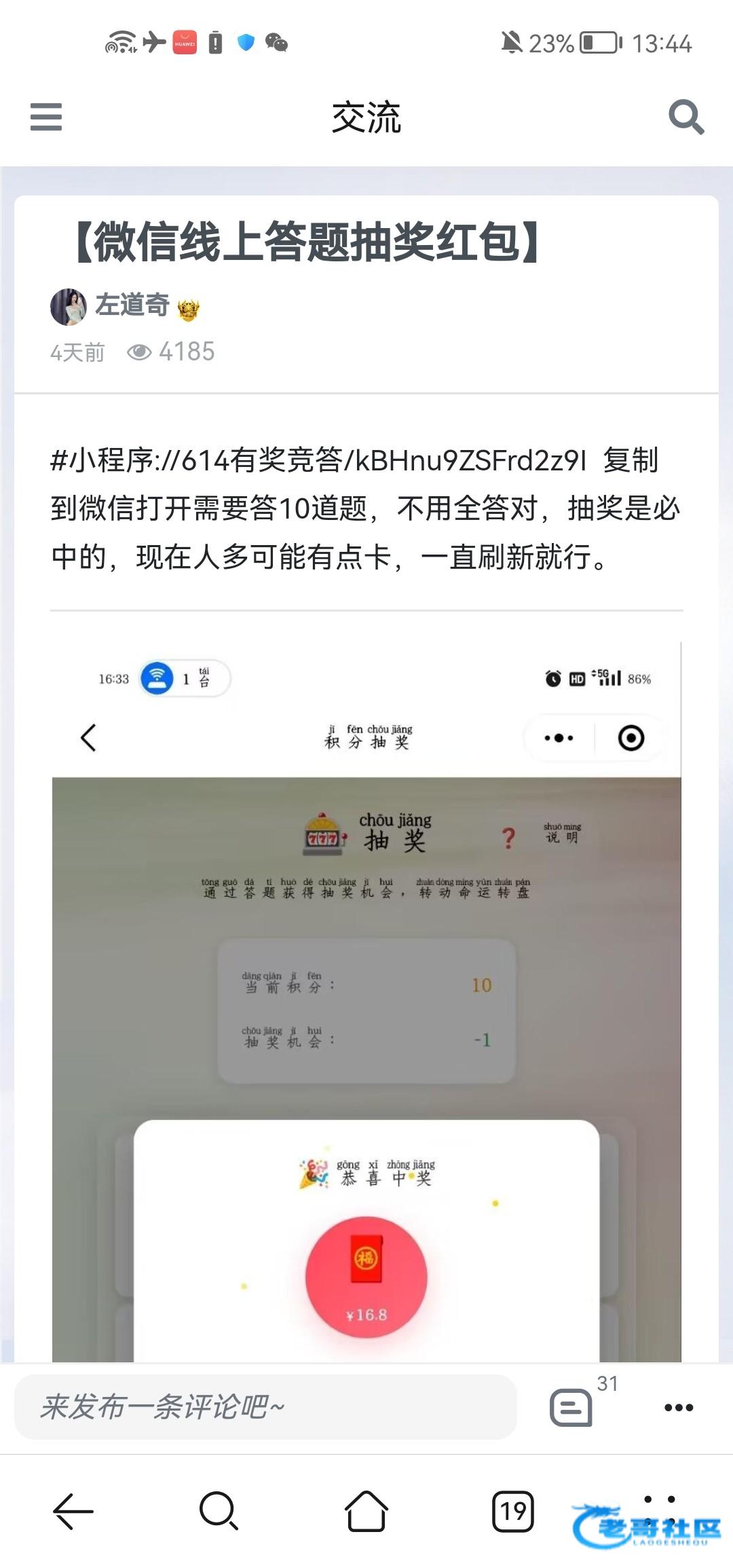 之前有参加过我之前发的那个答题抽奖帖的老哥,现在小程序开始补发,今天已经补发上限,明天早上九点有中过红包的老哥,可以进去小程序点击补发,需要下拉小程序删除,然后重新登入进去才会弹出补发页面,今天没名额,明天可以,没搞过的老哥无视,现在活动也结束了只有补发的人可以领。