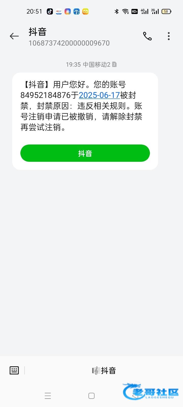 前天有老哥发的帖子抖音永久封禁解封的办法,我照着老哥发的去解封了两个号,解封成功了,然后过了一天早上去注销,下午就收到短信又恢复封禁了,有没有老哥是这样子的