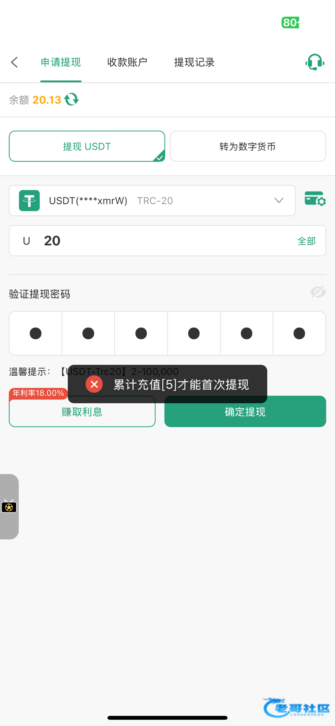打到80u了 客服说充5u激活账号 打充值的5u流水就可以提现了 能不能充