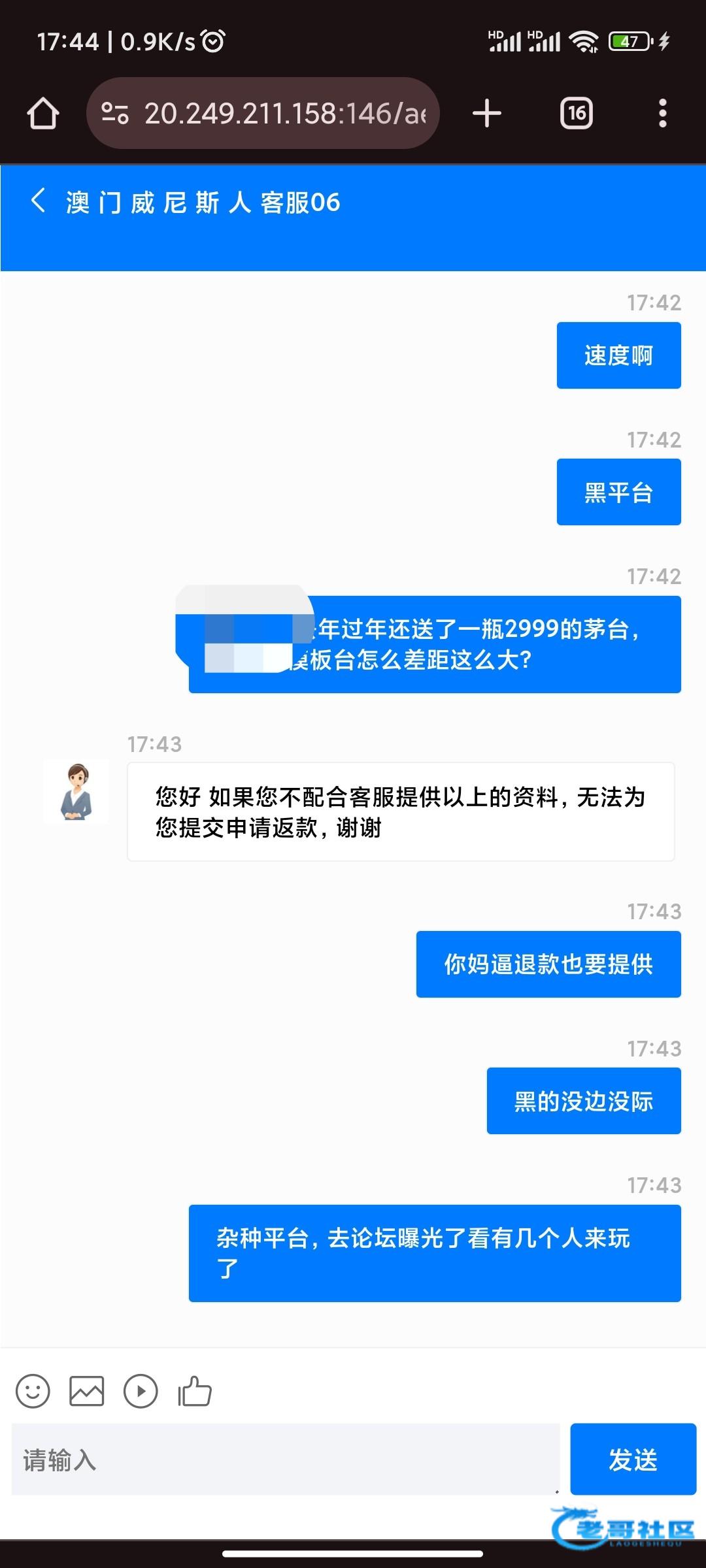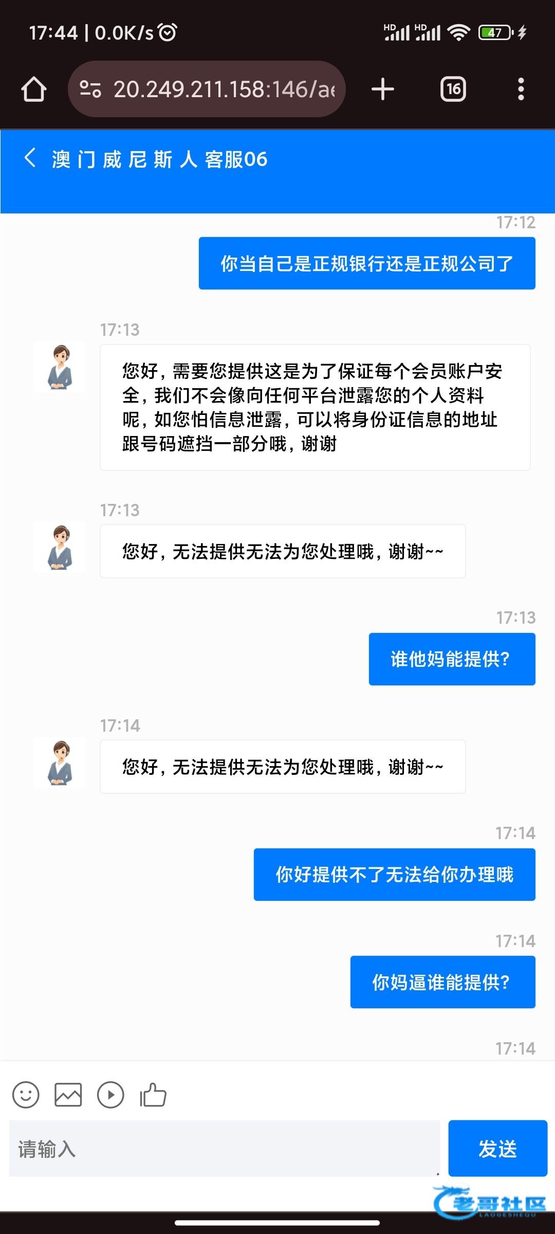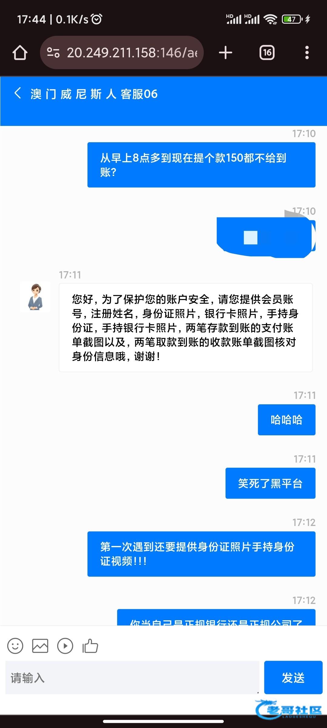 曝光黑平台146威尼斯人黑平台!平台写的注册送28彩金打上280,然后十倍流水提!输了,再然后下载送48彩金打上480,也是十倍流水提输了!再然后反水打上250不给出款说流水没打够继续打输了剩150从早上提款一直不给出说洗码不同步,然后又等到中午提款一直到现在直接让提供身份证照片手持身份证!还要你最近两笔的交易记录!黑逼平台(提供身份证,手持身份证)你们要玩就去!