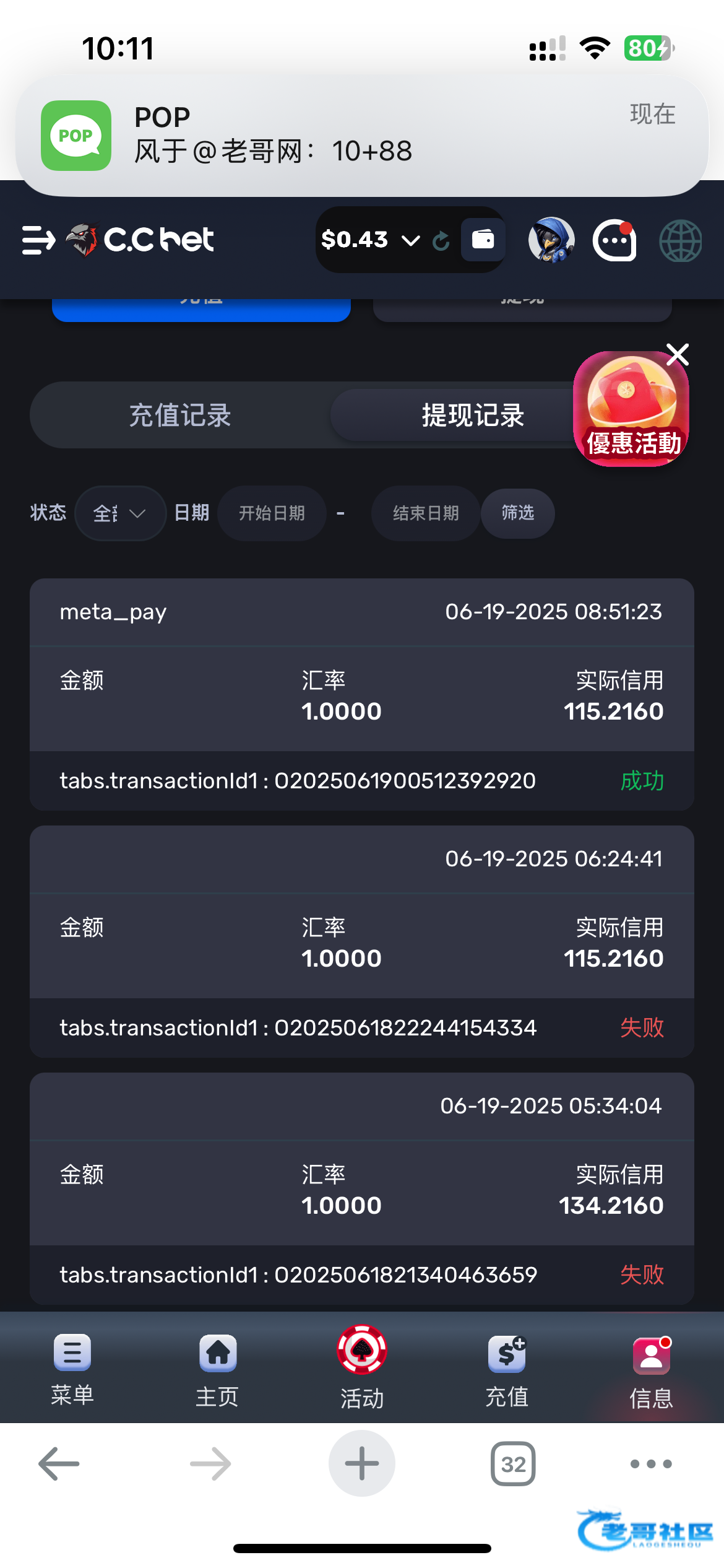 一共注册两个账号一个账号正常Wi-Fi注册另一个挂了VPN第一个账号没打出来第二个JDB超能三毛钱炸113转跳高高刷流水余额150然后绑定U地址提现失败问客服让充10U充了提现失败在问让打10U钱流水(转出到游戏账户转10U就行不要多转不然流水刷完再转进去会扣手续费)(还有就是转换10U的时候会弹出有优惠彩金未领取不要点去领取点继续充值不然要打15倍流水)打完流水记得实名一下KYC(21岁以上)通过后然后再提现 帐户余额打到几十U的就不要去博了黑了不就亏87多块应该撸的人也挺多的后面会黑吧建议余额多的搞10U去搏一下白嫖就行下面⬇️是包浆图和出款图(从论坛发布到白嫖下款用总计7个小时)最近倒下了就不团了下次再给兄弟们团