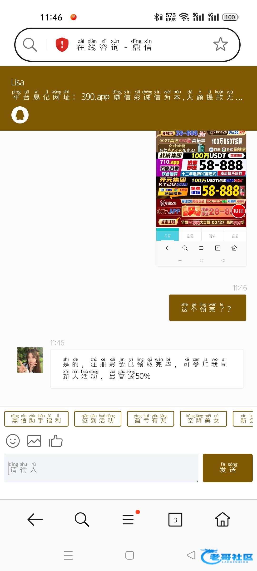 注册好了之后直接找在线客服问他怎么领取,注册即送38茶水,他会叫你加闪圈的客服申请,需要有最近有玩加拿大的投注上分记录才行。