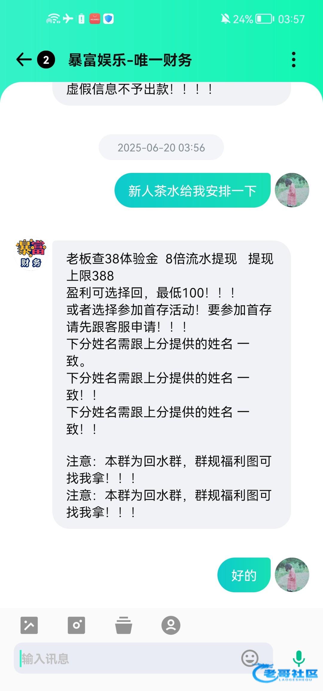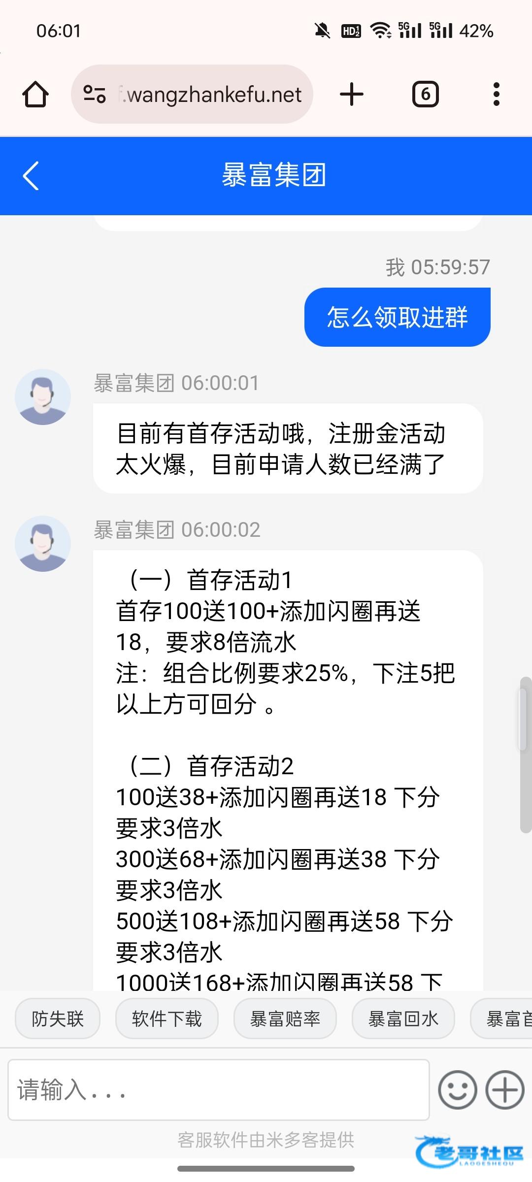 这个暴富和之前那个暴富28是同一个公司的,唯一不同的是这次的暴富28是要进群娱乐,我下面放的网址链接是直达暴富在线客服,点进去之后问客服怎么领取进群即送38彩金,然后他会给你们发 一个说信的app,注册好了添加客服拉你进群。反正话术自己想。客服问来源图我也放下面。