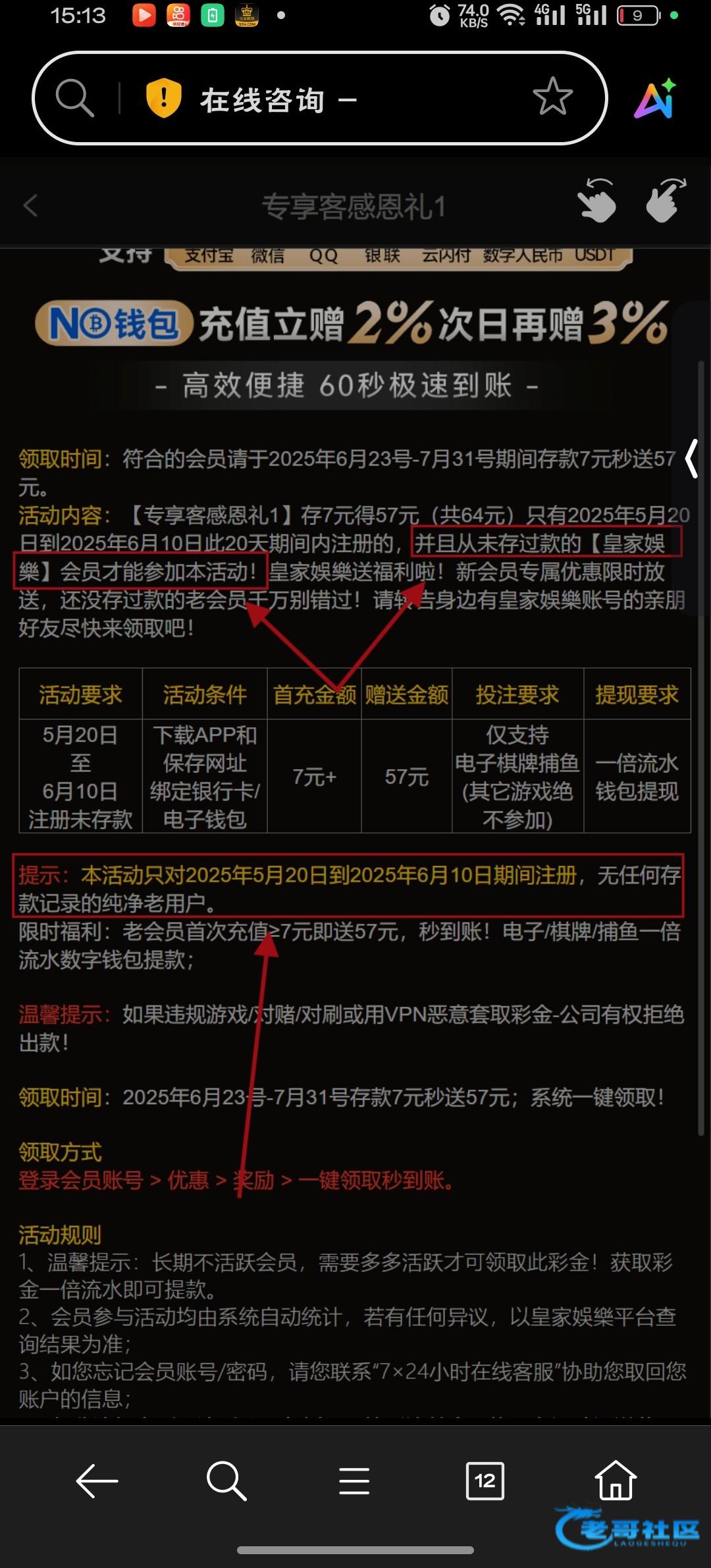皇家娱乐,老玩家5月20日到6月10日没充值过的老玩家,充值7元送57元,我踏马刚好5月21日充过,参加不了,老哥们有在5月20到6月10日没冲过的,可以去撸一波,我也想混个有效贴。网址 904.com