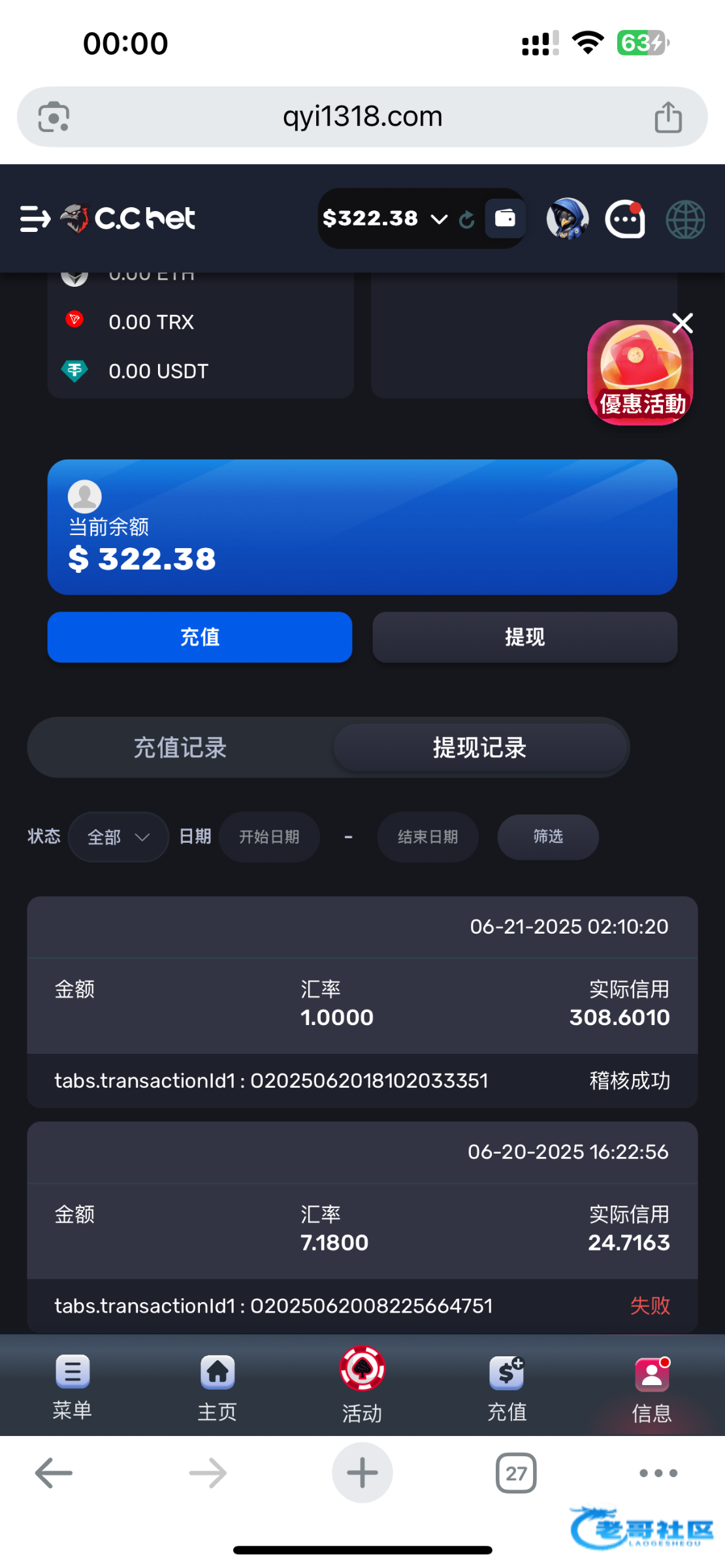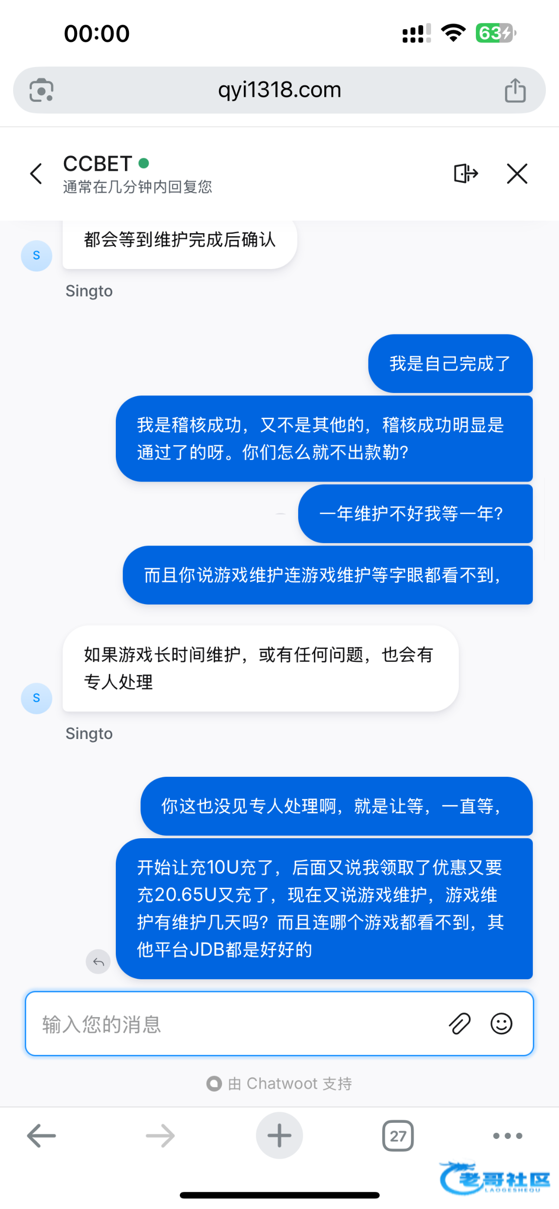 跟上个老哥的情况一样,也是说JDB游戏维护。开始让充值等额10U法币通道一直维护,没法充值好不容易搞到U充值了,又说领了首充优惠,20U又让充值,充值之后显示,稽核成功,问客服说什么时候到账客服说玩了JDB游戏的没法抓取数据,JDB游戏维护,我都服了什么JB游戏维护几天,而且JDB这个游戏都看不到,游戏维护好歹也会显示个维护啊,他这个JDB是直接消失不见了,搞了几天人都搞麻了,