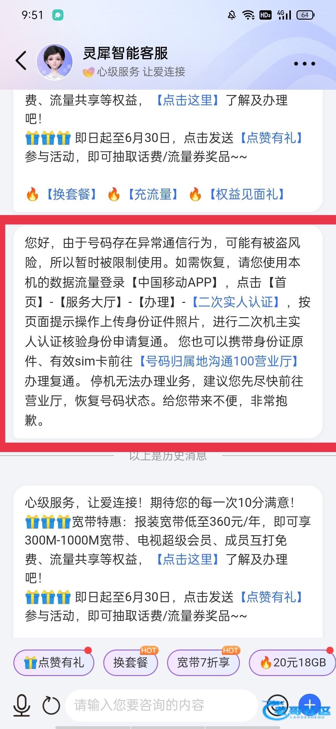 老哥你是哪里的卡,我跟你一样接了境外上个月停了两次了,两次二次实名可以用了,不敢接了现在,就怕再次限制app二次实名不通过,要到归属地营业厅解封就麻烦了,我广州移动卡,现在湖南老家