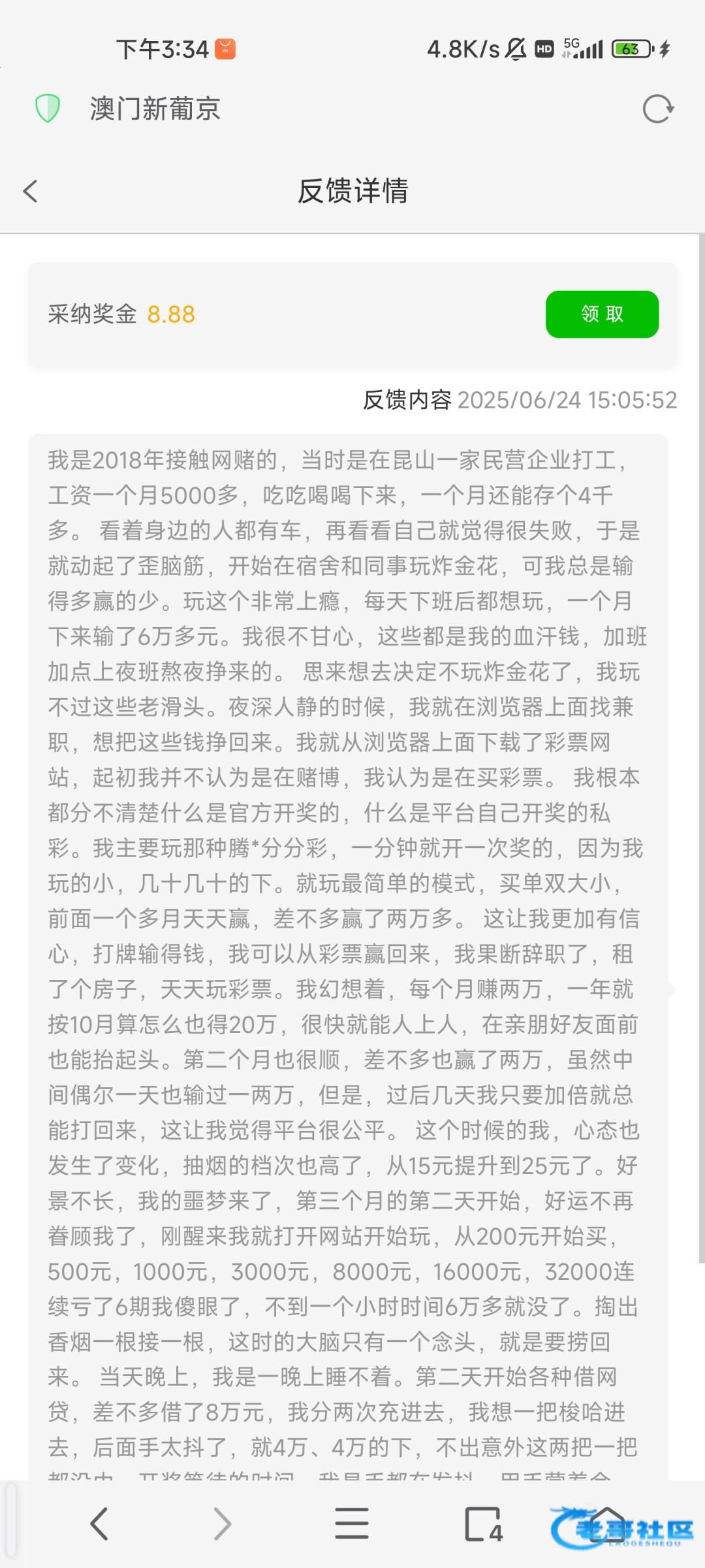 赢个几天,又会全部输进去,一点债务还不了,还额外增加新的债务。我也被冻结过银行卡,封过支付宝,可是我总能找到送钱的办法,难道这辈子我就戒不了赌吗?我到底是造了什么孽!