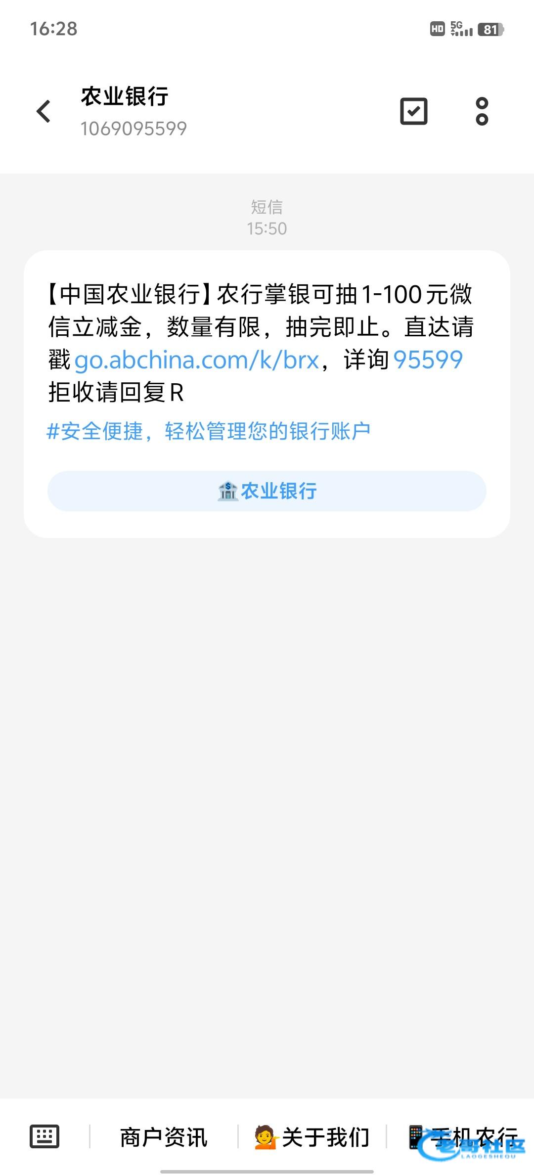 【中国农业银行】农行掌银可抽1-100元微信立减金,数量有限,抽完即止。直达请戳 go.abchina.com/k/brx,详询95599拒收请回复R