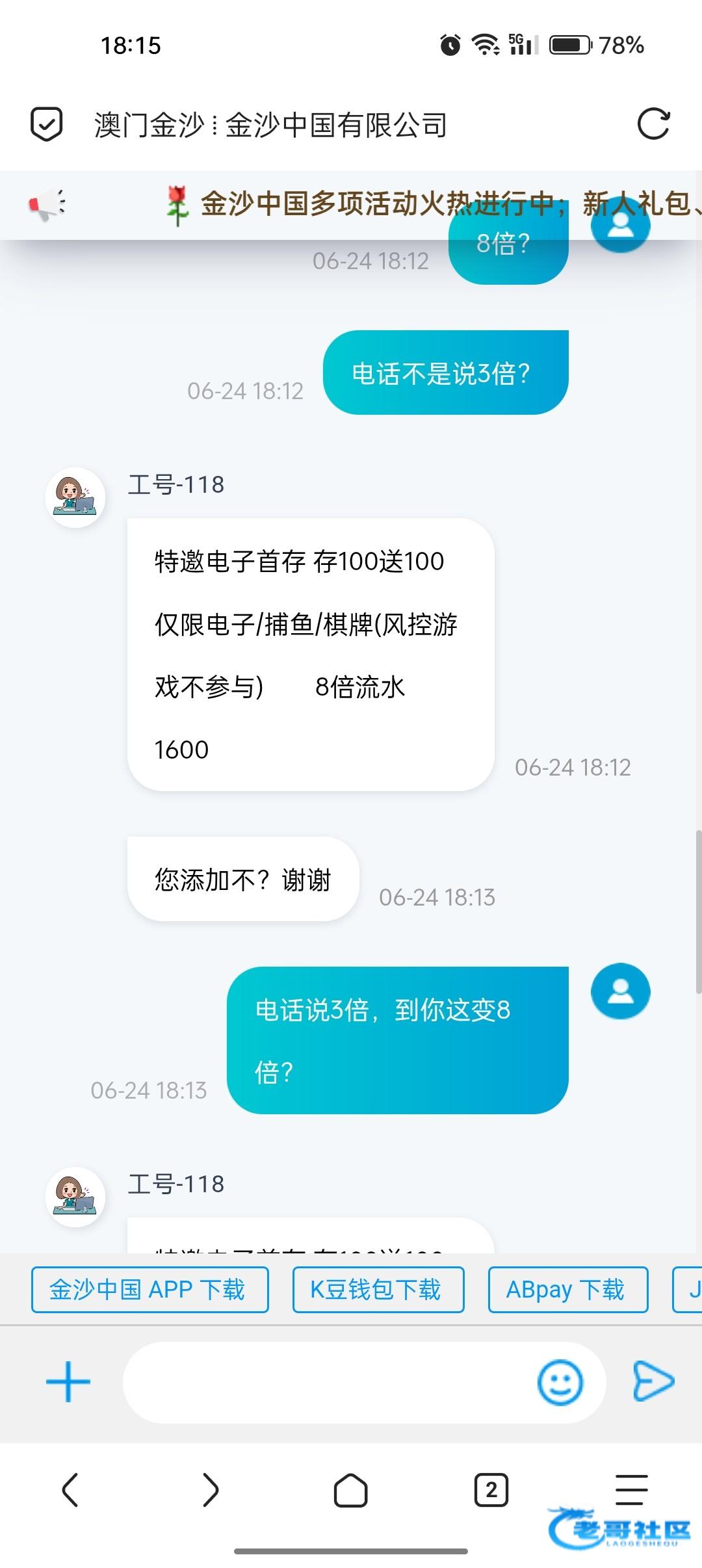打电话过来100+100,说3倍流水,不限制游戏,足足通话了10分钟,找客服后又说要8倍,问她怎么回事,立马挂电话,傻逼金沙中国,电子也是一点水没有,各种卡夺宝,进去就给你炸一点,后面空到死