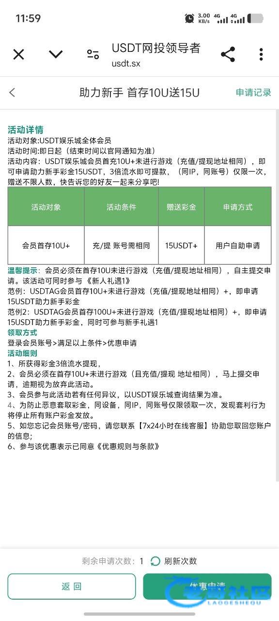 USDT台首存10+15充值地址需要绑定的提现地址相同,这就需要用到冷钱包充值。不要开加速器避免多IP。流水也不高三杯水,就类似于充值70送105三水感觉这个活动还可以USDT.AG