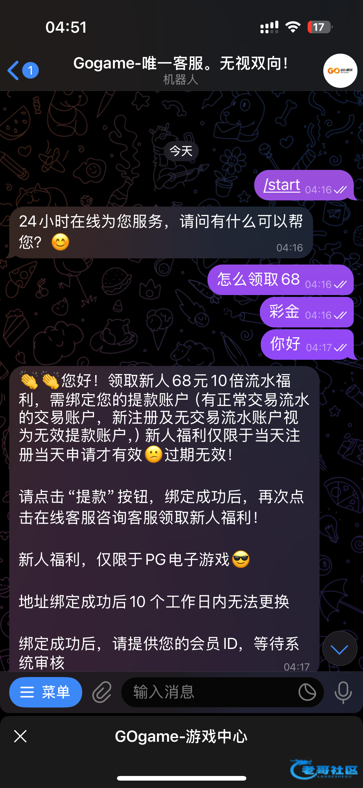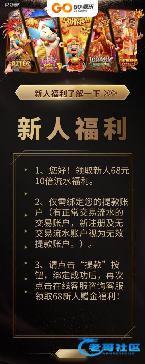 飞机进 @GOgamevip_bot 会自动有账户了 然后绑定提现usdt 找客服发ID申请68彩金 十倍流水 只能玩pg 客服说提现不用充值 我没打出来 不知道到底要不要充值
