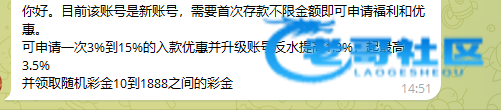 你好。目前该账号是新账号,需要首次存款不限金额即可申请福利和优惠。可申请一次3%到15%的入款优惠并升级账号反水提高1.3%,起最高3.5%并领取随机彩金10到1888之间的彩金