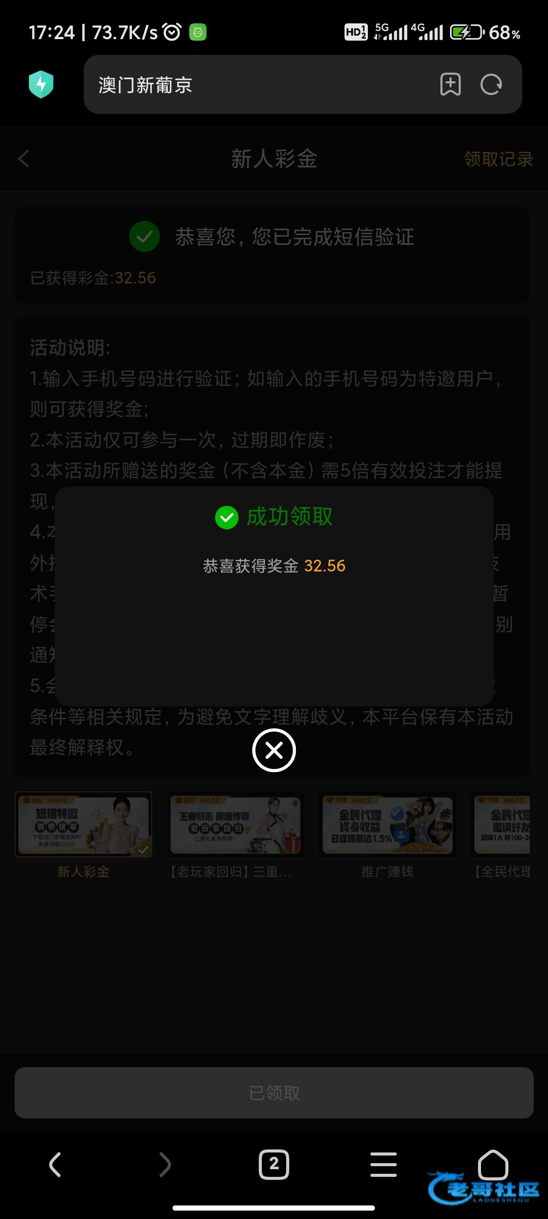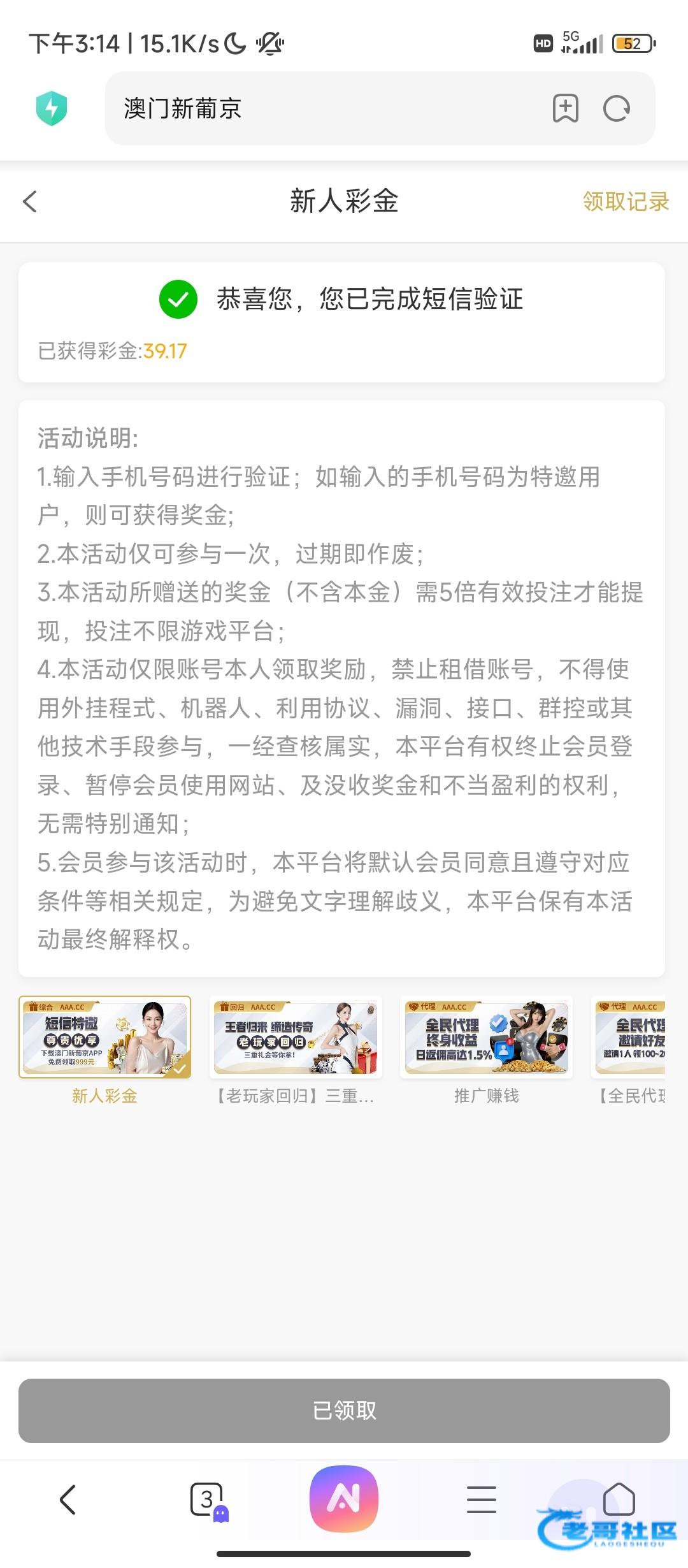 之前验证手机号领了50多今天上去一看有领了20多下150