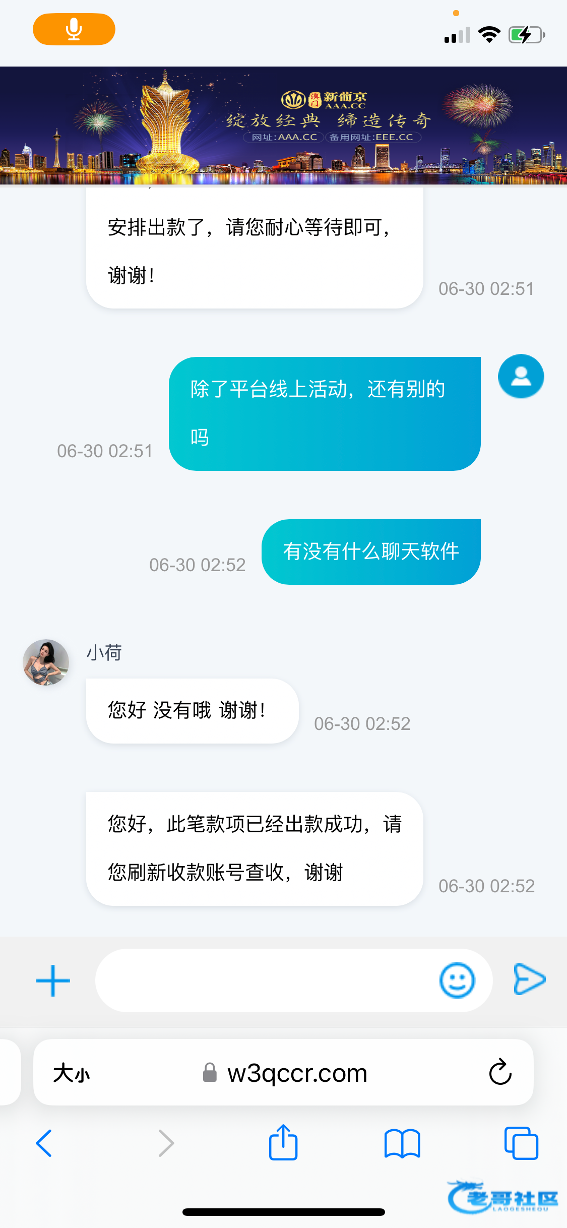 新葡京AAA碰瓷电话特邀288彩金一倍水不限制游戏最低取款288最高1288,以前发过白嫖能出款,我白嫖后随便充了几百块,后面很久没玩了,今天突然给我送288本来是叫我注册送我说以前注册充值玩过他就让我联系在线客服给我送了。网址 aaa.cc 注册过没注册过的都可以去碰一下。碰到了来反馈一下,没碰到的老哥不要中出我。
